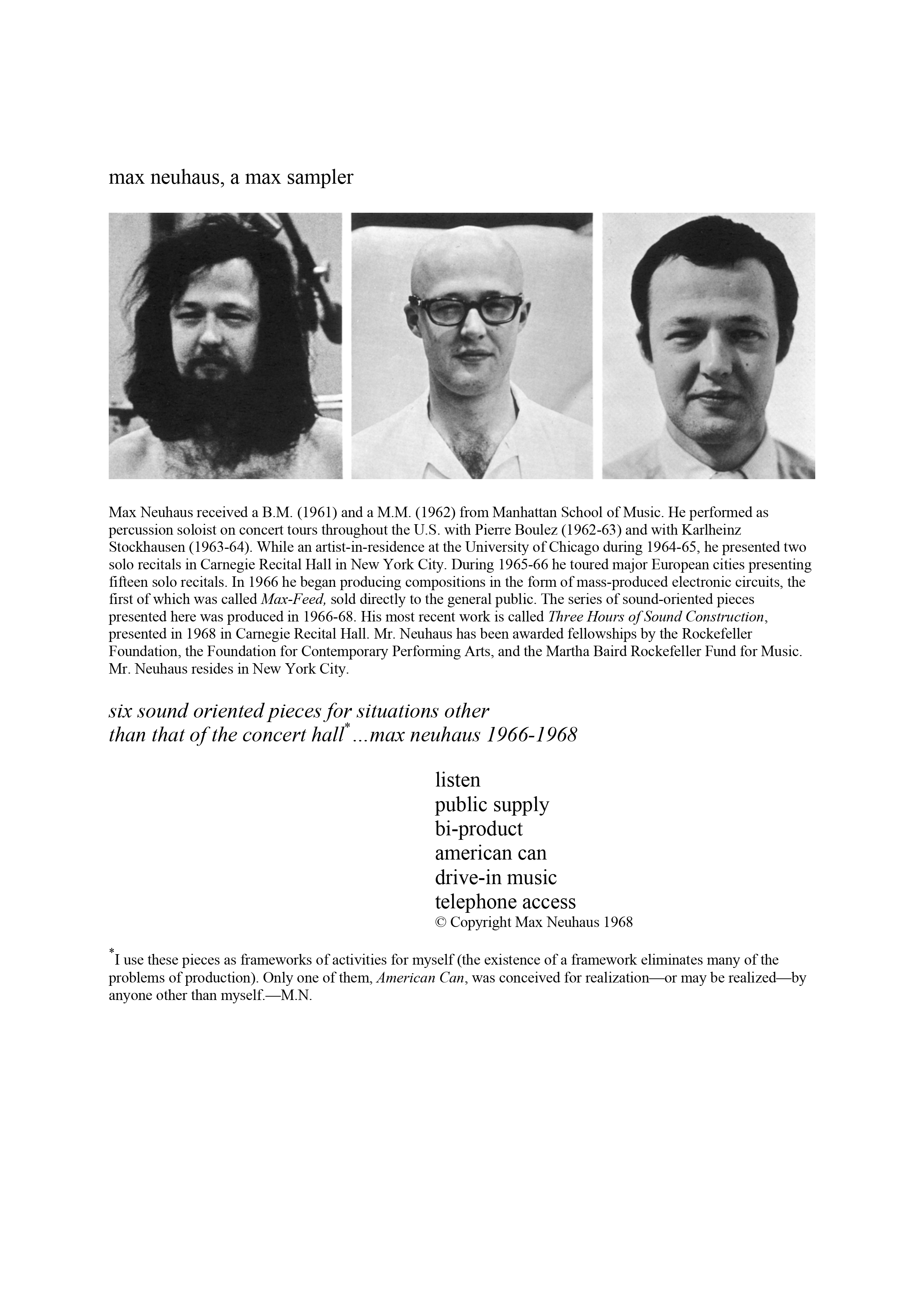Listen, Public Supply, Bi-produit, American Can, Drive in Music, Telephon Acces. Source: Music of the Avant-garde.