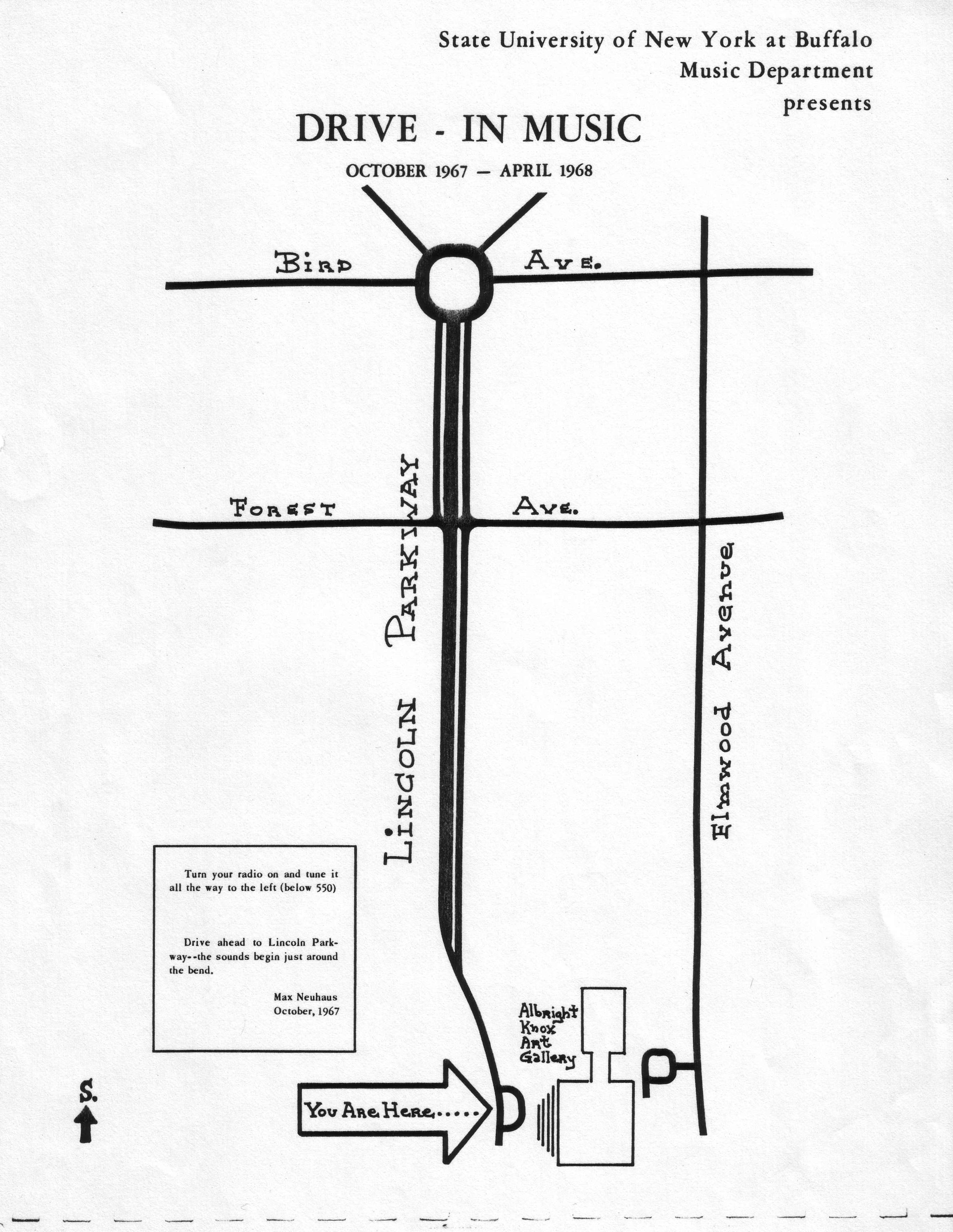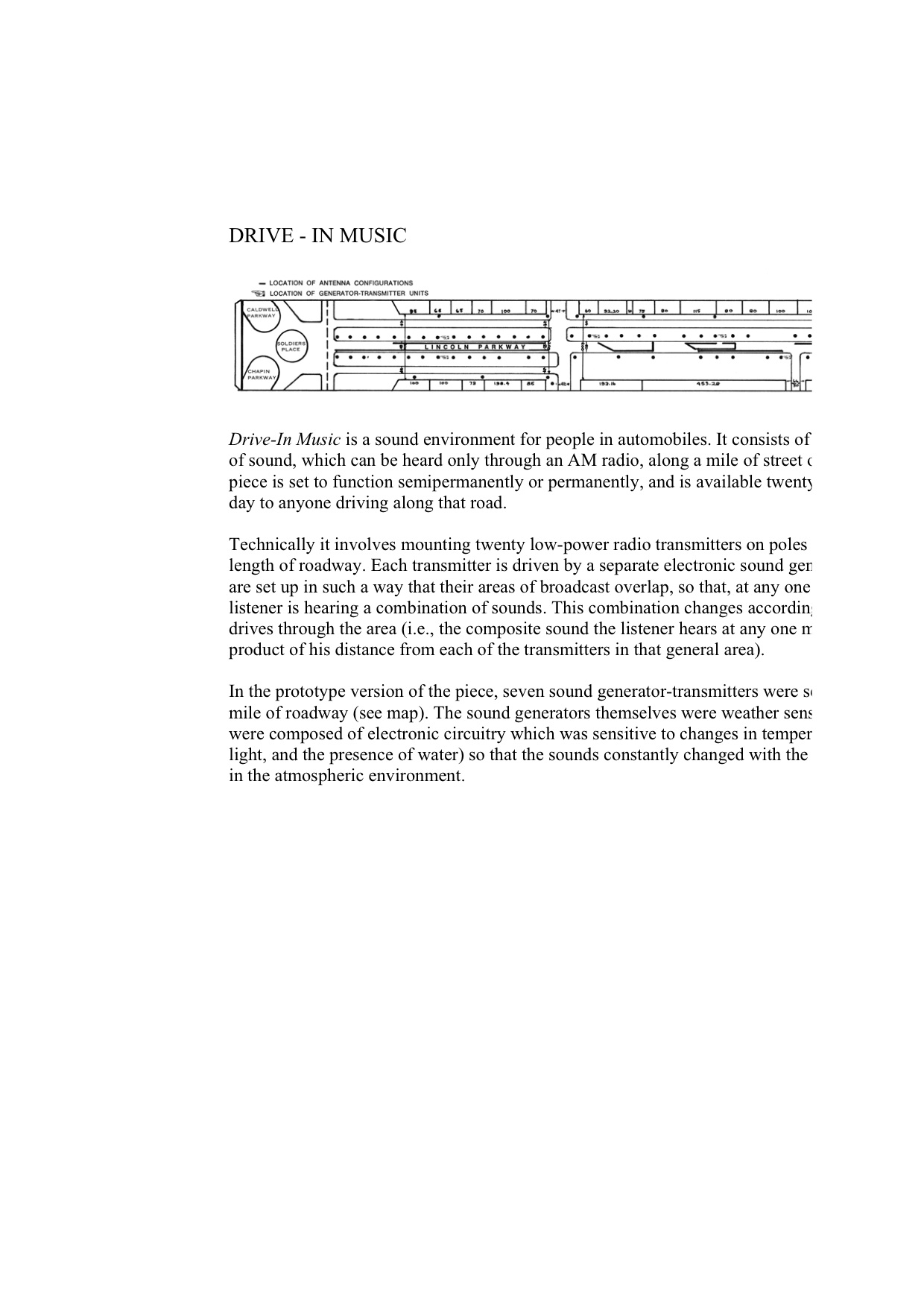 One of Neuhaus's first site-specific sound installations (1967-1968), in which he placed low-power radio transmitters along a road for drivers to hear over their car radios.