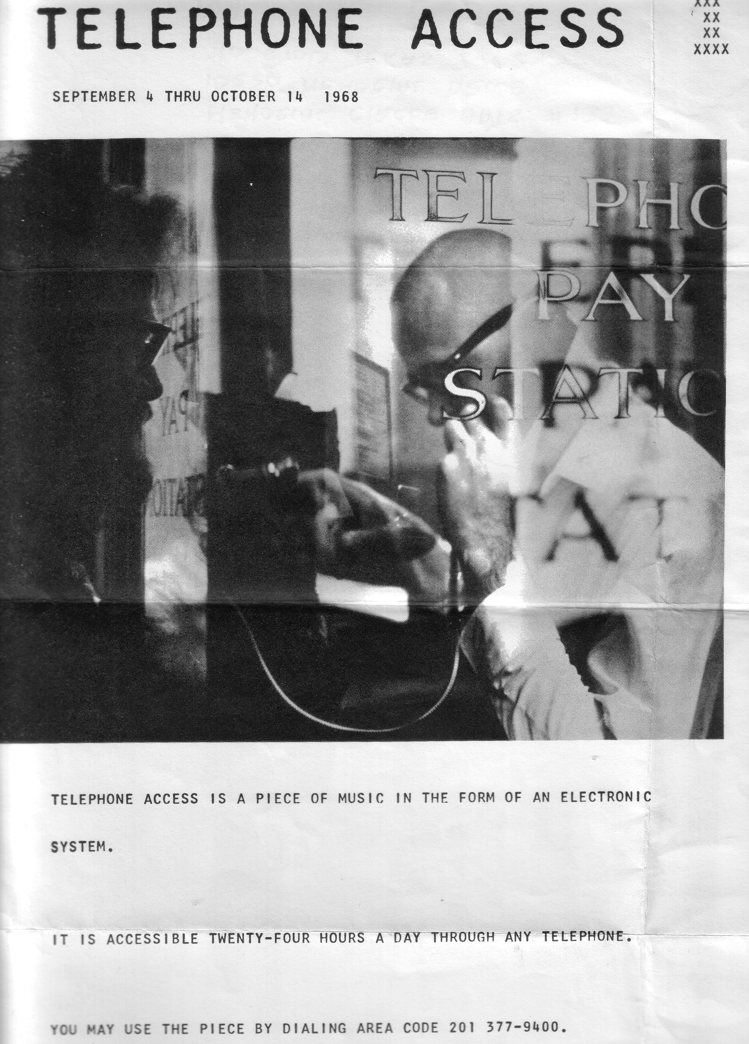 An experimental piece that used the telephone network as a medium for sound, allowing people to "sonically walk in from any telephone".