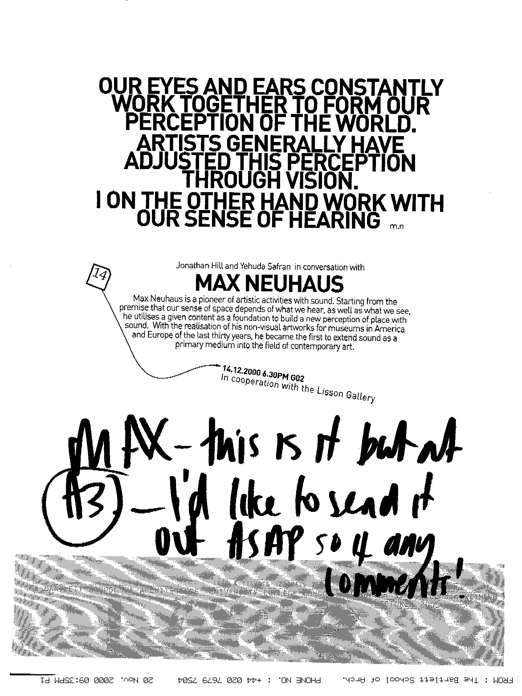 Max Neuhaus delivered a lecture at The Bartlett School of Architecture in London. In the lecture, entitled The Place of Sound in Design, Neuhaus elaborated on his pioneering work and his central thesis that auditory perception is as crucial as visual perception in defining our experience of space. He argued that the physical design of a space and its sonic environment are deeply intertwined.