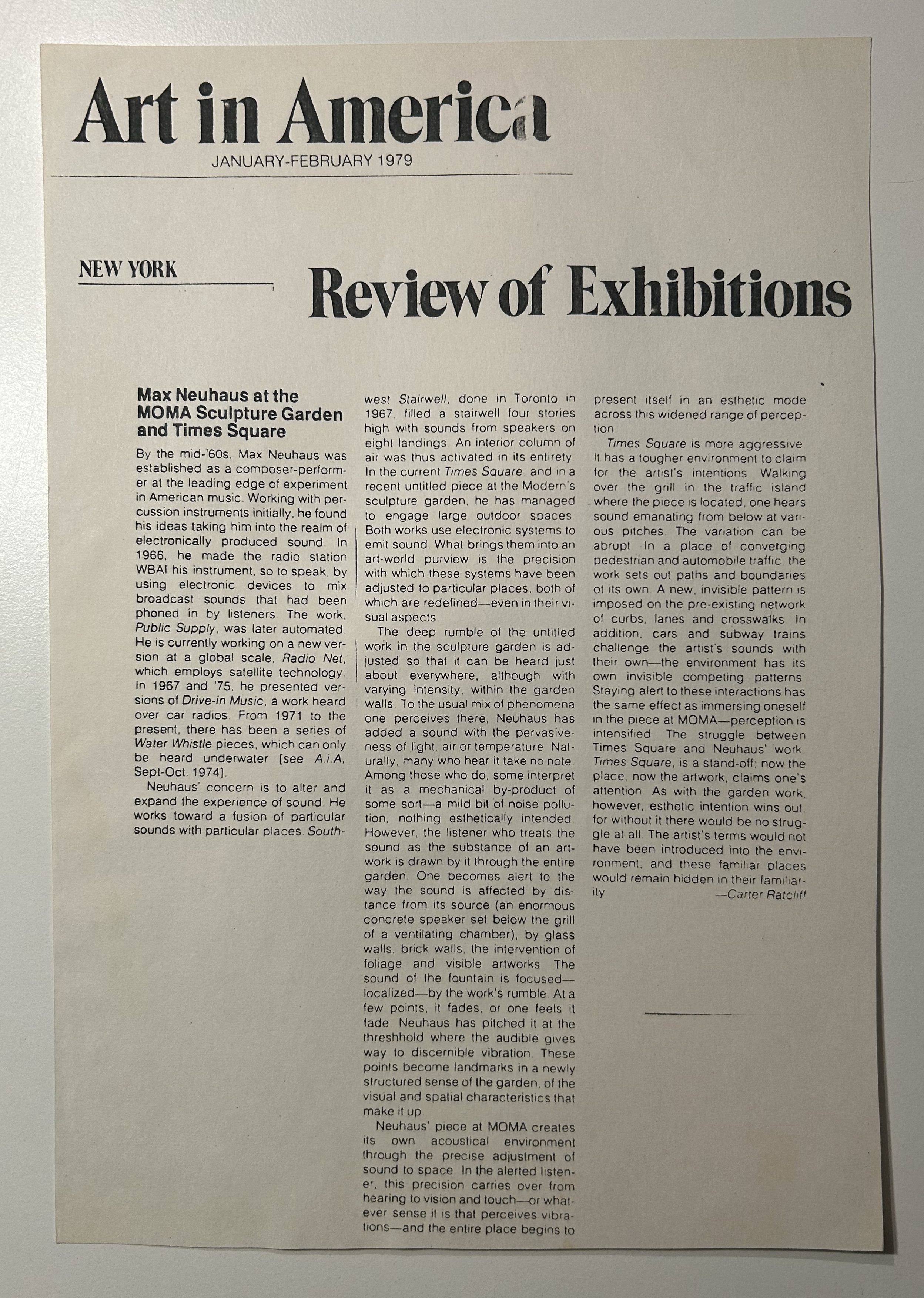 Carter Ratcliff, Max Neuhaus at the MOMA Sculpture Garden and Time Square. Art in America January-February 1979 p. 143
