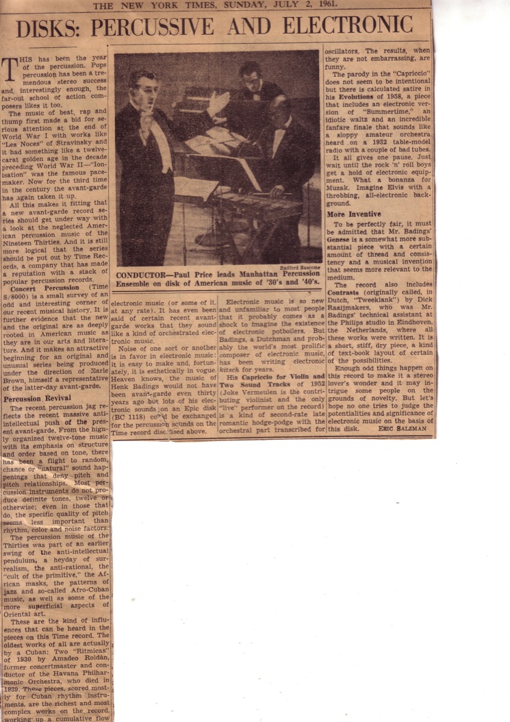 Eric Salzman, Disks: Percussive and Electronic.” The New York Times (July 2, 1961).