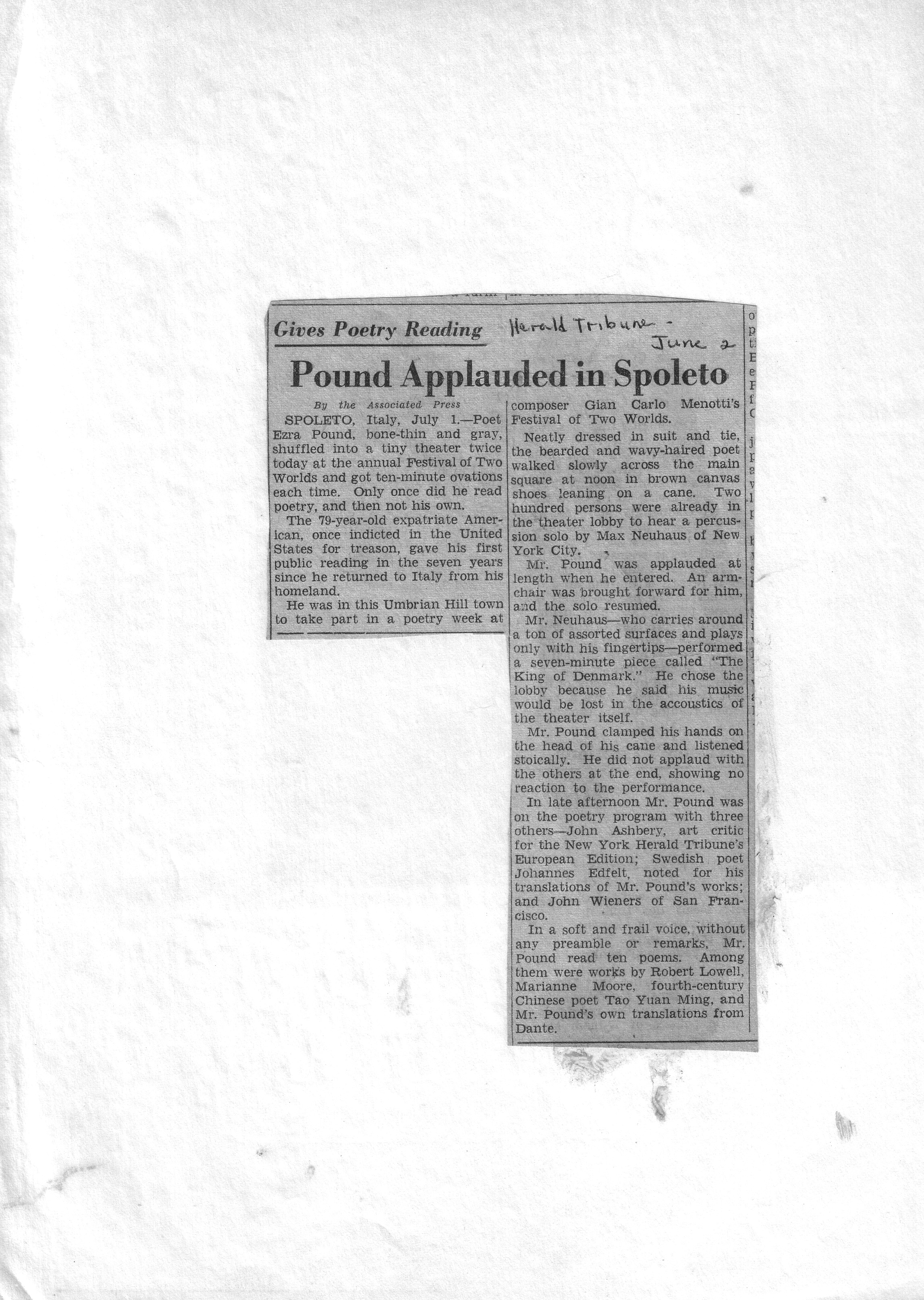 Gives Poetry Reading, "Applauded in Spoleto", European Edition at Spoleto. N.Y. Herald Tribune. July 2, 1966.