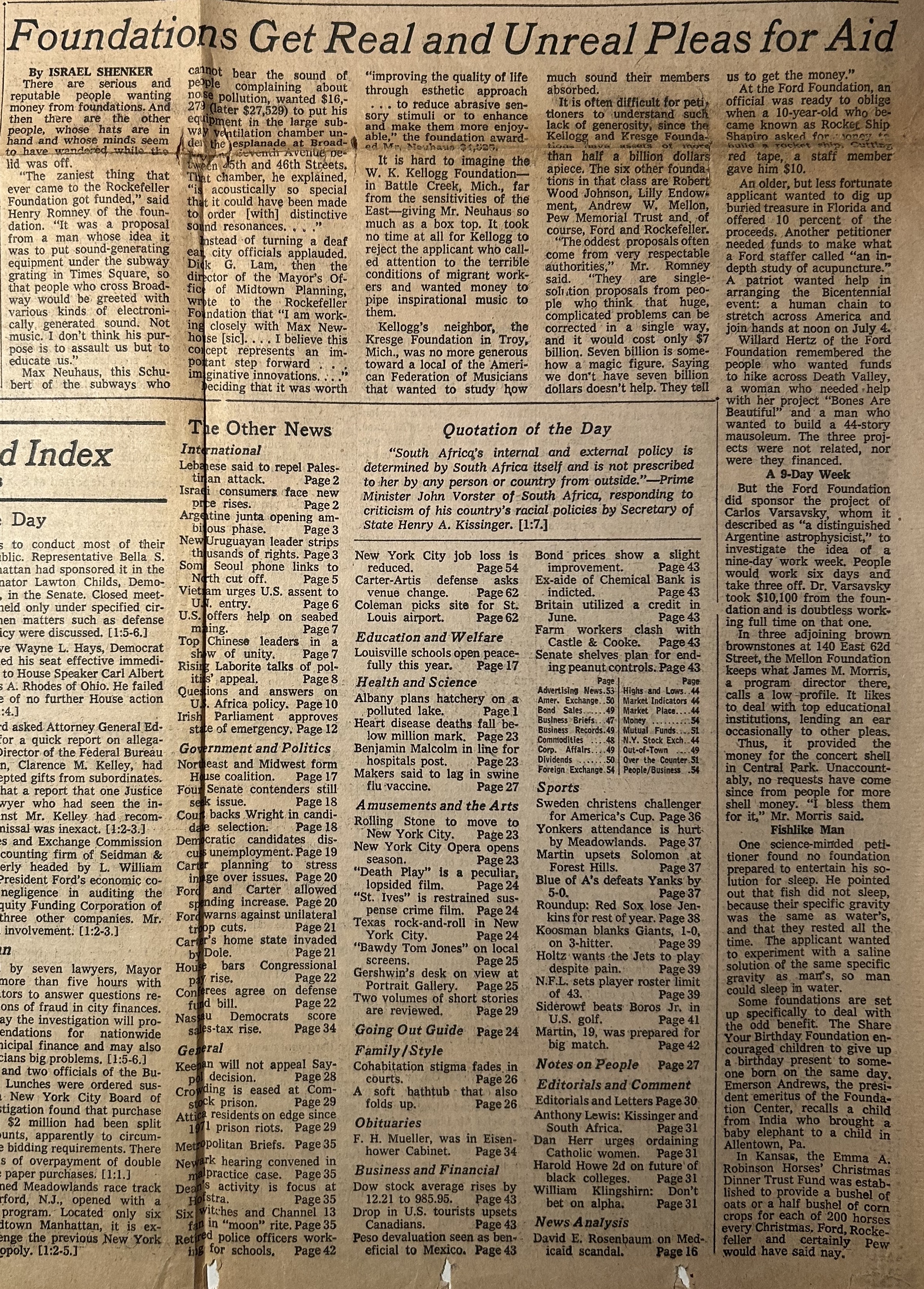 Israel Shenker, "Foundations Get Real and Unreal Pleas for Aid," New York Times, Toronto, September 2, 1976, p. 66.