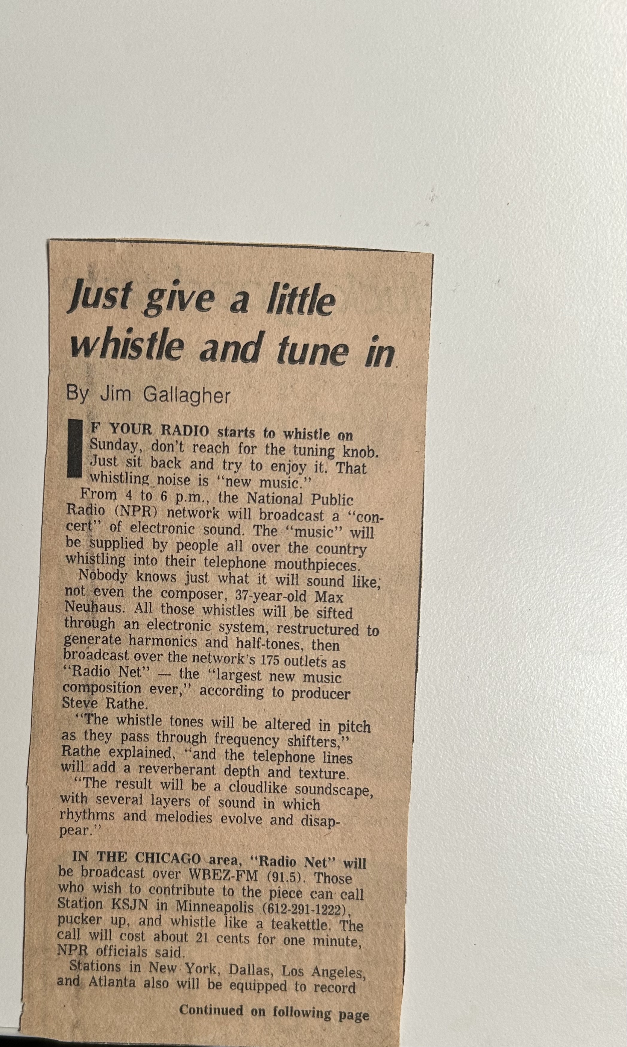 Jim Gallagher, Just give a little whistle and tune in. Minneapolis Tribune on January 19, 1972