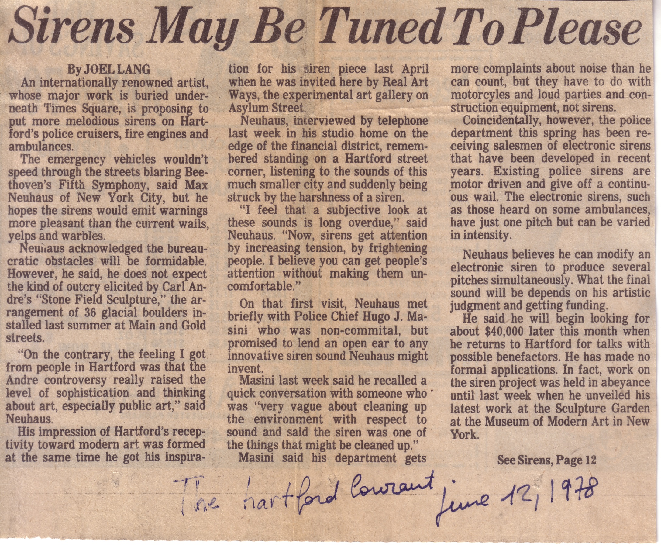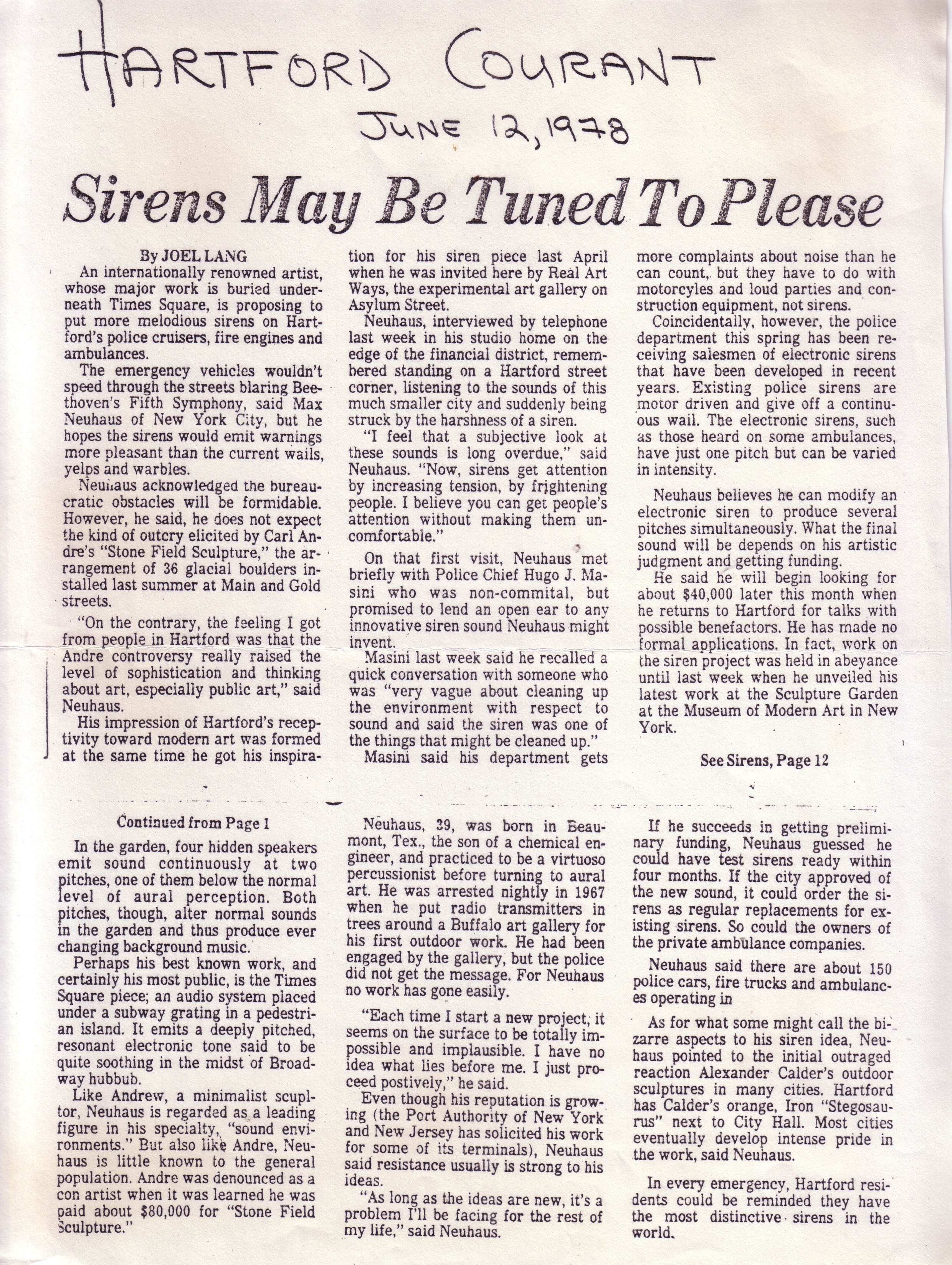 Lang, Joel. “Sirens May Be Tuned to Please.” Hartford Courant. June 12, 1978.