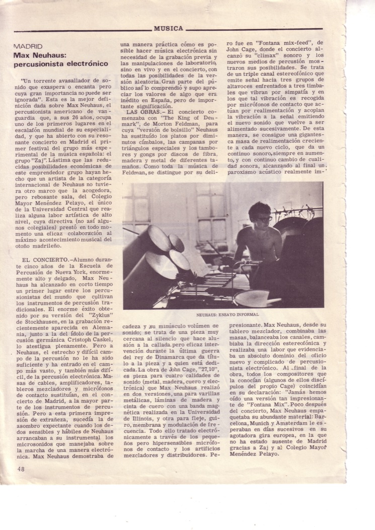 Max Neuhaus: percusionista eletronico, Colegio Mayor Menéndez Pelayo, Musix News, Madrid, November 27, 1965.