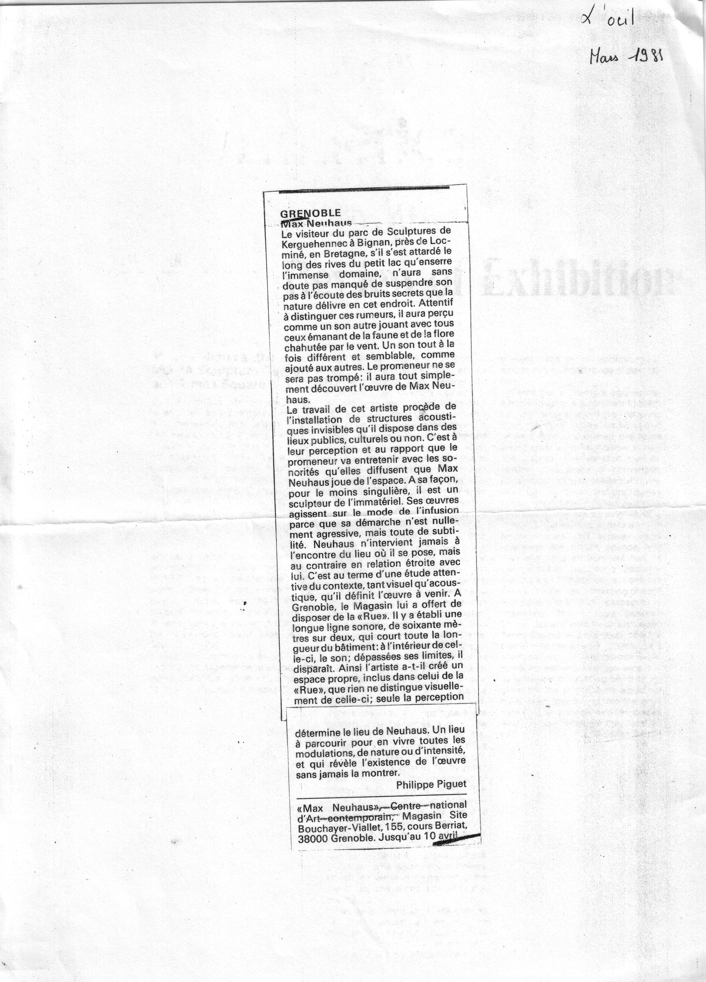 Philippe Piquet, Max Neuhaus Centre-national d'Art contemporain - Magasin Site Bouchayer-Viallet, 155 cours Berriat, Grenoble. Avril 1988