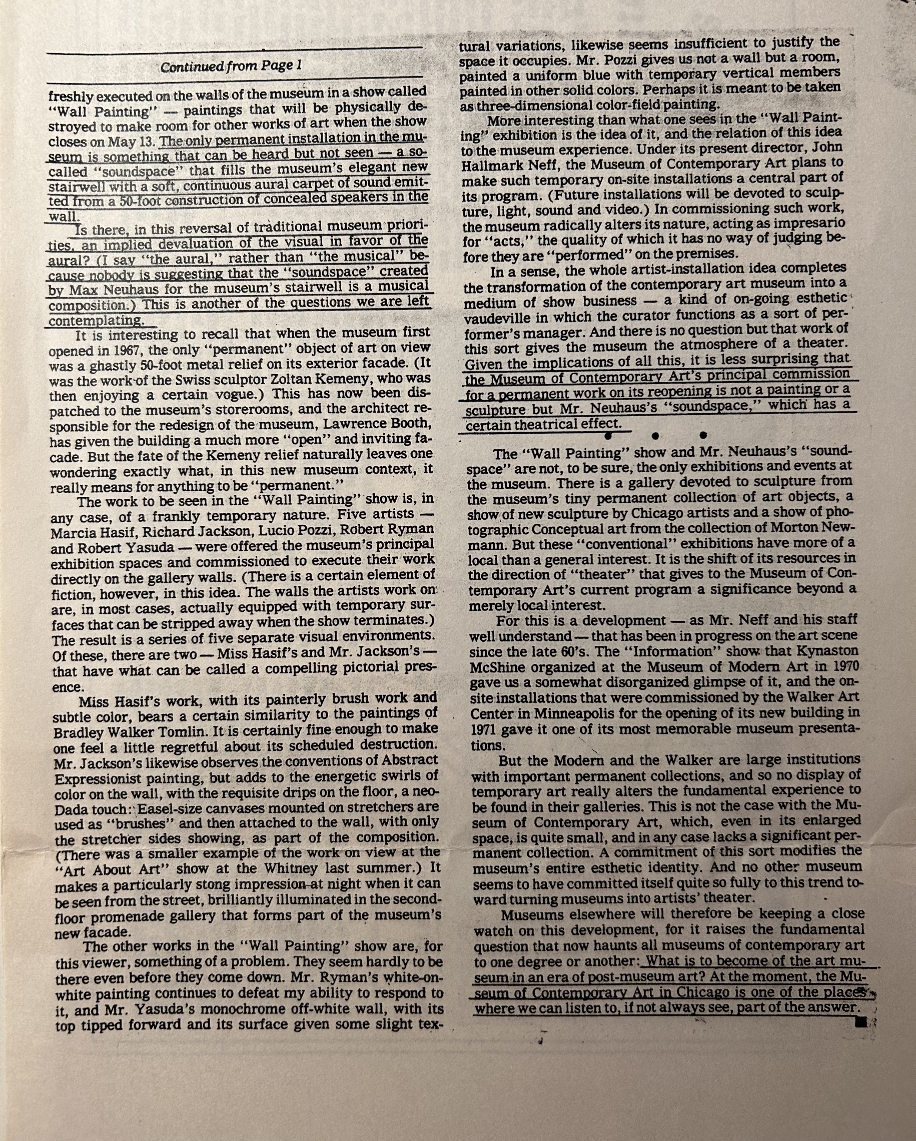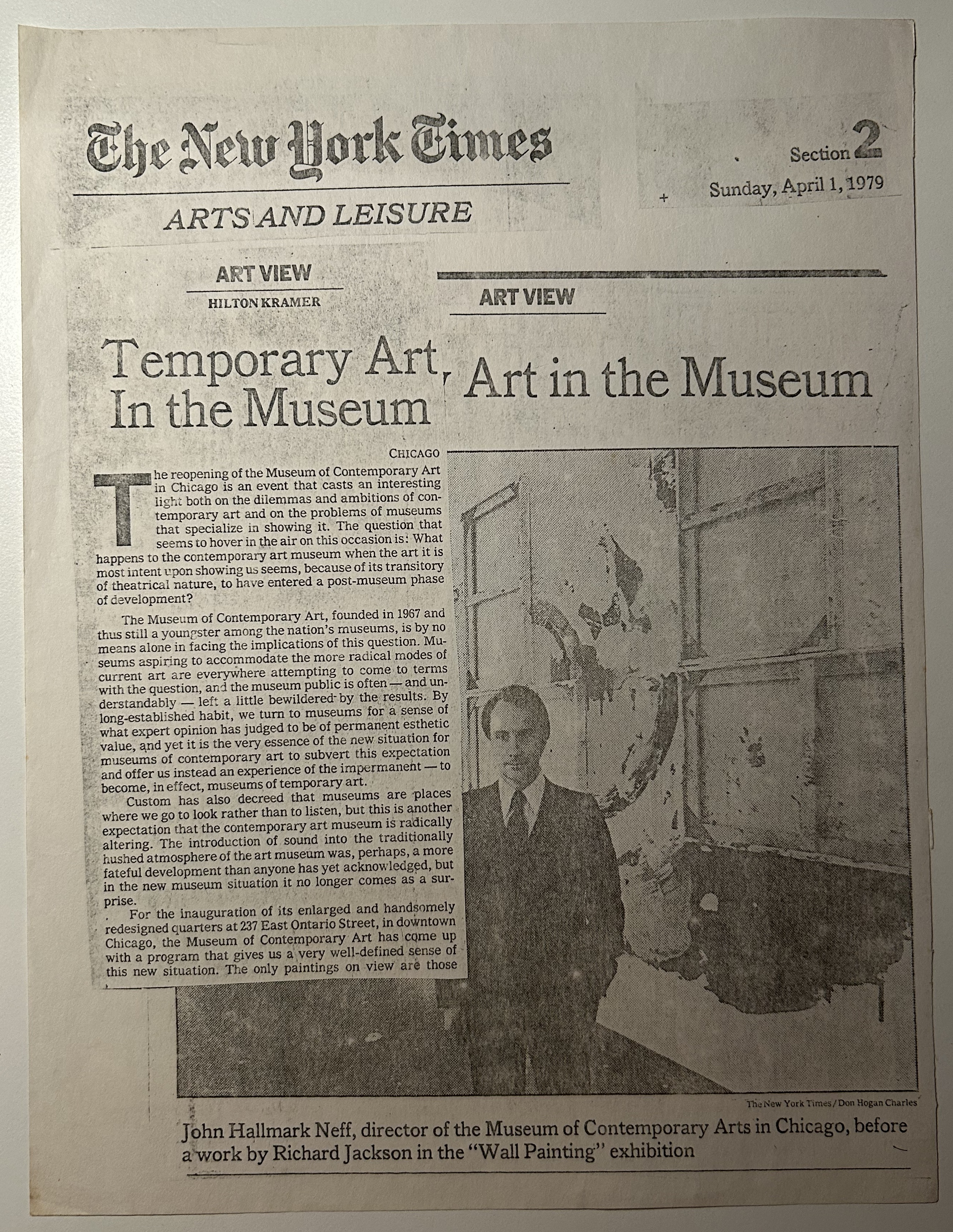 Kramer Hilton, "Temporary Art in the Museum", Art View Chicago, The New York Times, April 1, 1979