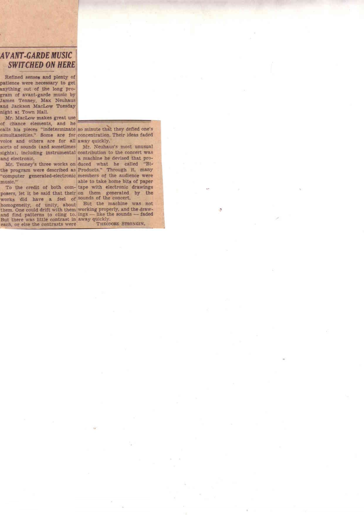Theodore Strongin's review, "Avant-Garde Music Switched on Here," in The New York Times on September 14, 1966, was a critical take on a Town Hall concert of experimental music and poetry. The concert featured works by Jackson MacLow, Max Neuhaus, and James Tenney. Strongin, a music critic often skeptical of the avant-garde, reviewed the event from the perspective of a traditionalist musician