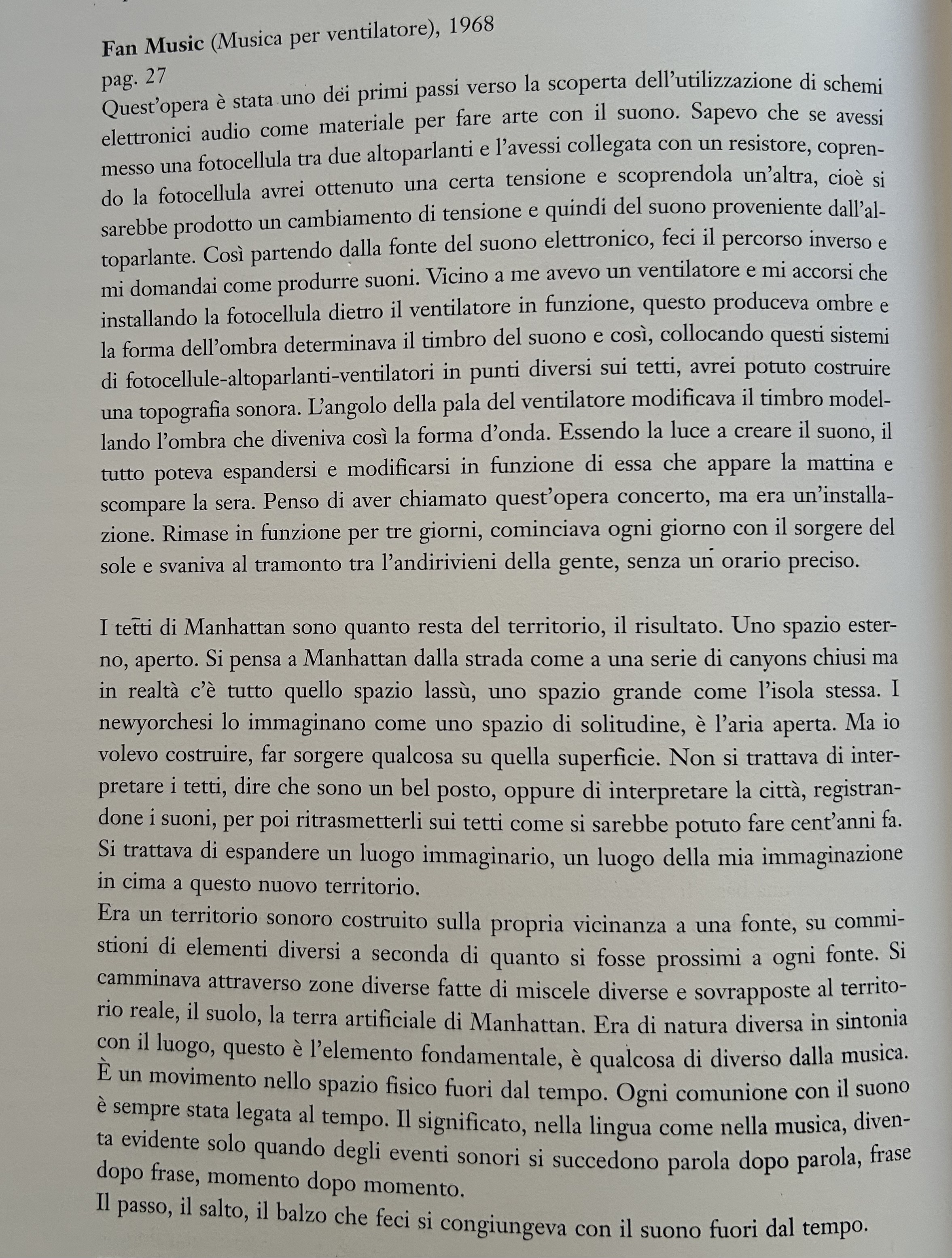 Fan Music by Max Neuhaus, 1968 published in Max Neuhaus, Evocare L' udibile, (text in Italian and Franch) Published by Charta, 1995