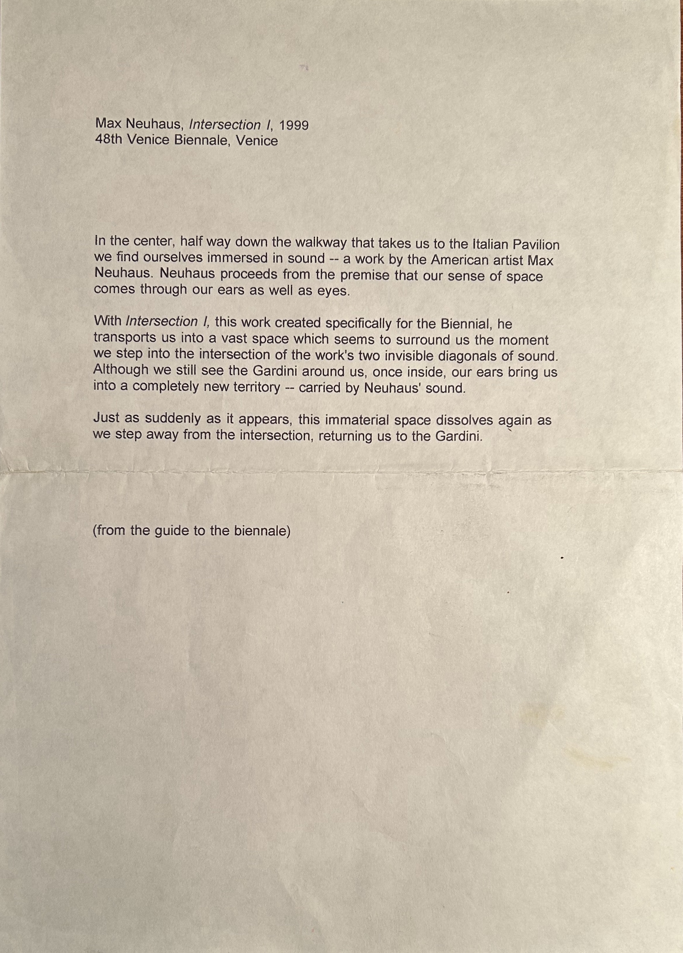 Max Neuhaus Intersection I, 1999, 48th Venice Biennale, Venice. (from the guide to the biennale) 1999