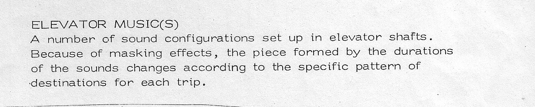 Search for "I am struck by the sense of dislocation in most elevators. As elevator manufacturers have made starts and stops smoother and acceleration more gradual, we have inadvertently been left in a perceptual limbo, with only some numbered lights to tell us that we are actually moving. We enter in one place, the doors close and with a barely perceptible sense of motion somehow when the doors open we are in a different place. It was probably this which was the impetus for the idea of making a sound work which would articulate an elevator journey, a subtle aural presence which would evolve with each trip. In thinking further about the idea it became clear that by controlling sound in the car with the elevator's motion and position, one could make a sound work which was unique for the itinerary of each elevator trip reflecting the pathways of the elevator's passengers. To take a simple example, if each floor has its own sound, then each of these sounds would be heard by passengers as a different point in the elevator's path as it passes up and down its shaft way. The elevator's movement would create a succession of the sounds. Thus, what is heard by passengers depends not only on their destinations – where they get on or off determines which of the floors they pass and thus the sounds they hear – but also on the destinations of the other passengers in the same elevator car. Their destinations determine the pattern of elevator speeds and stops which compress and expand the sound elements in time slowing and speeding their succession. There are, of course, more complex options as well.