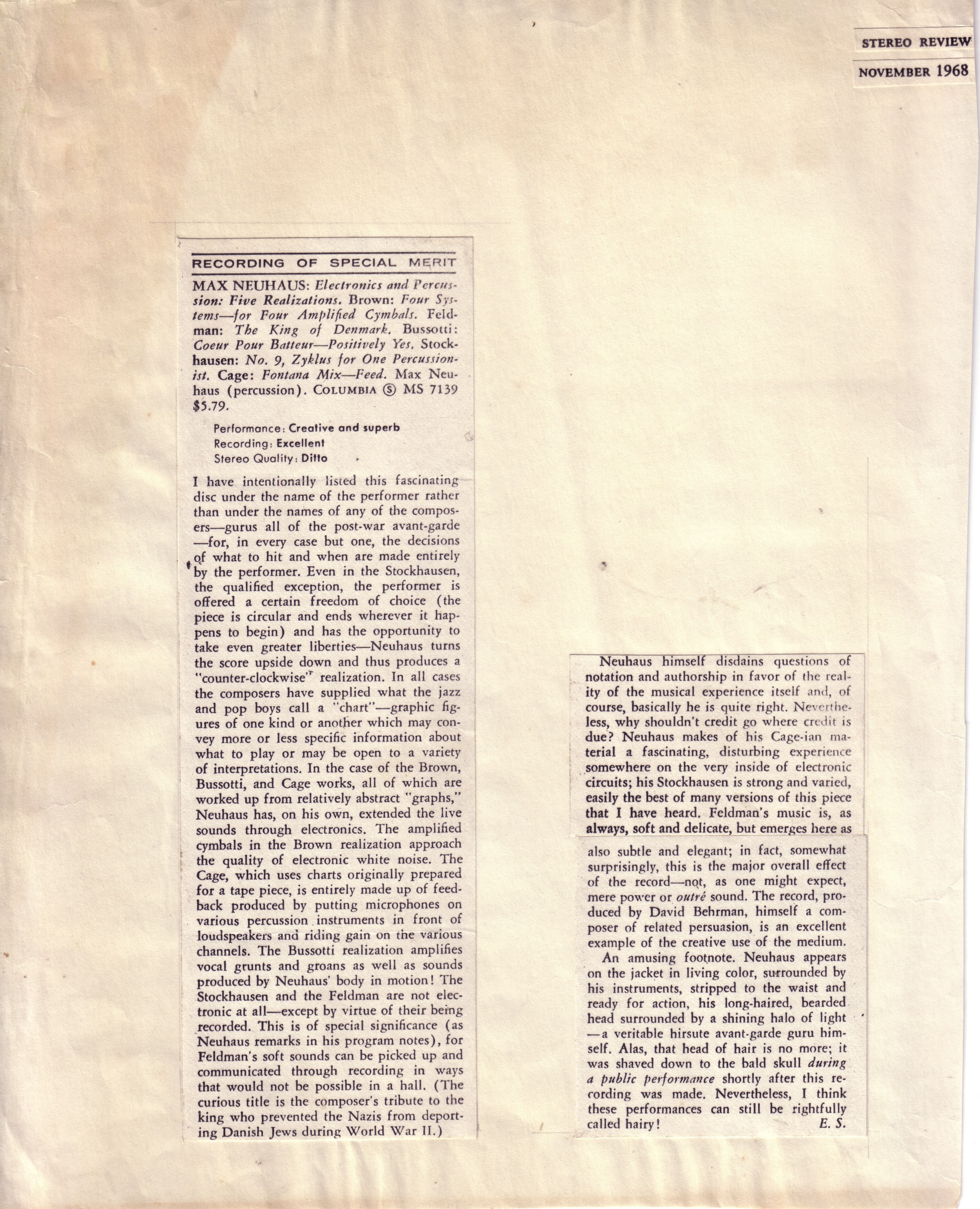 In 1968, Max Neuhaus recorded the album Electronics and Percussion: Five Realizations by Max Neuhaus (Columbia Masterworks, MS 7139), produced by David Behrman. On this album, Neuhaus performs pieces by five avant-garde composers: Earle Brown, Morton Feldman, Sylvano Bussotti, Karlheinz Stockhausen, and John Cage.