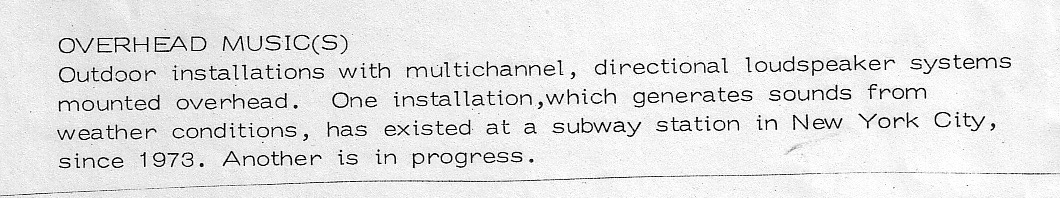 Outdoor installations with multichannel, directional loudspeaker systems, mounted overhead. One installation, which generates sounds from weather conditions, has existed at a subway station in New York City since 1973. Another is in progress.