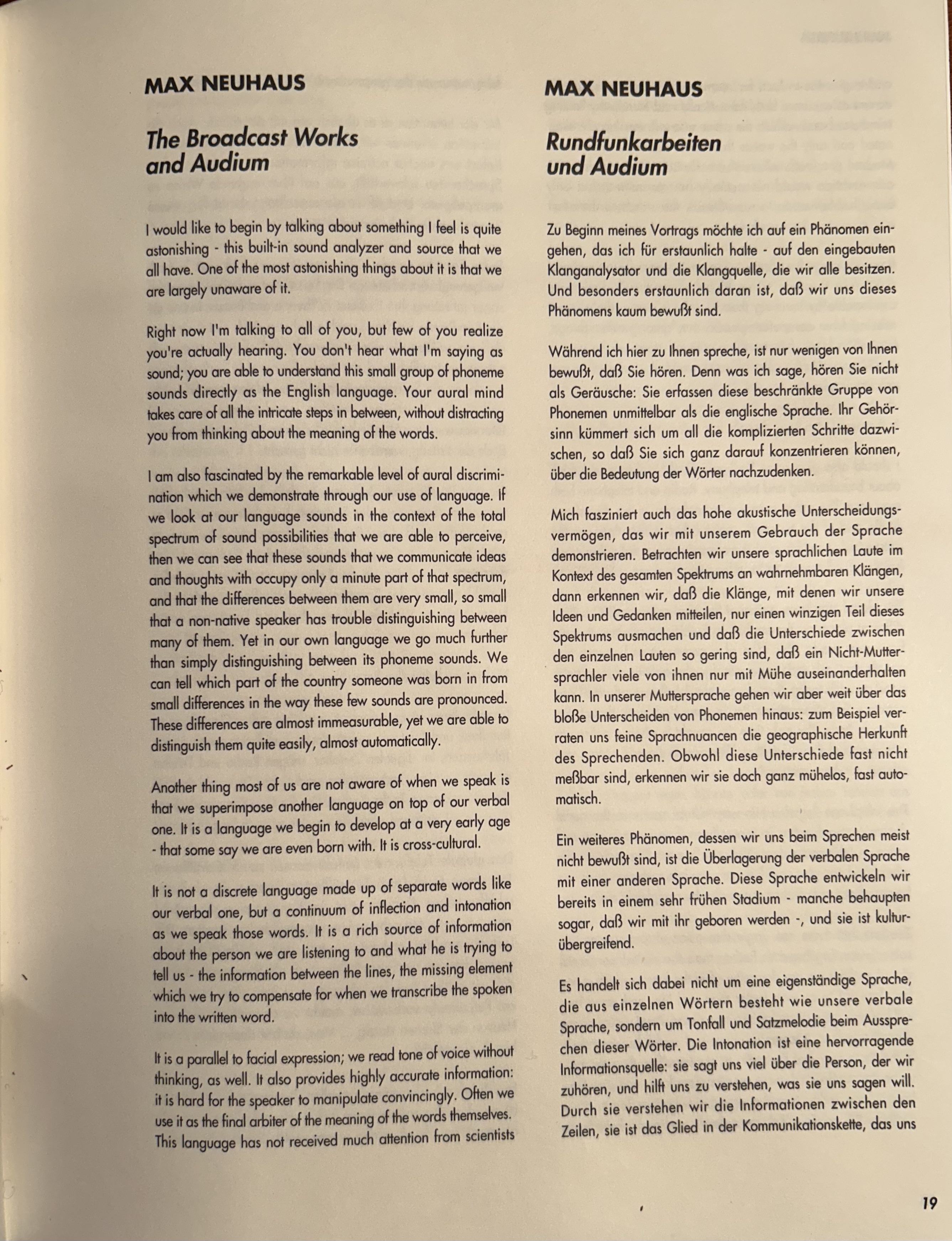 MAX NEUHAUS, SOUND DESIGN, 1994. First published in Zeitgleich [English, German] The Symposium, The seminar, The exhibition, Transit, Kunstahalle Tirol. Vien: Triton, 1994 (Catalog)