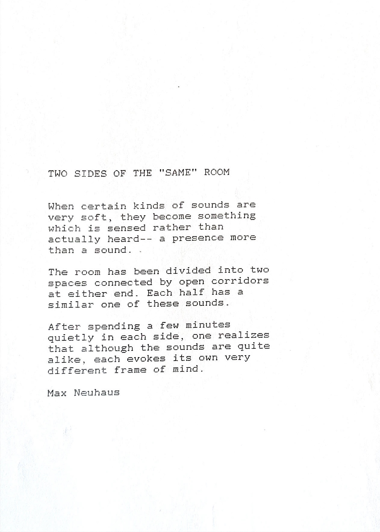 Exhibitions / Max Neuhaus, Two Sides of the 'Same' Room, Dallas Museum of Art, January 28, 1990 April 22, 1990