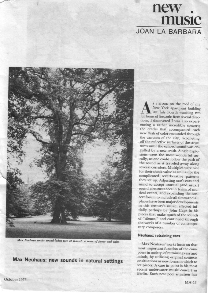 First published as: Joan La Barbara, "Max Neuhaus: new sounds in natural settings", Musical America, October 1977