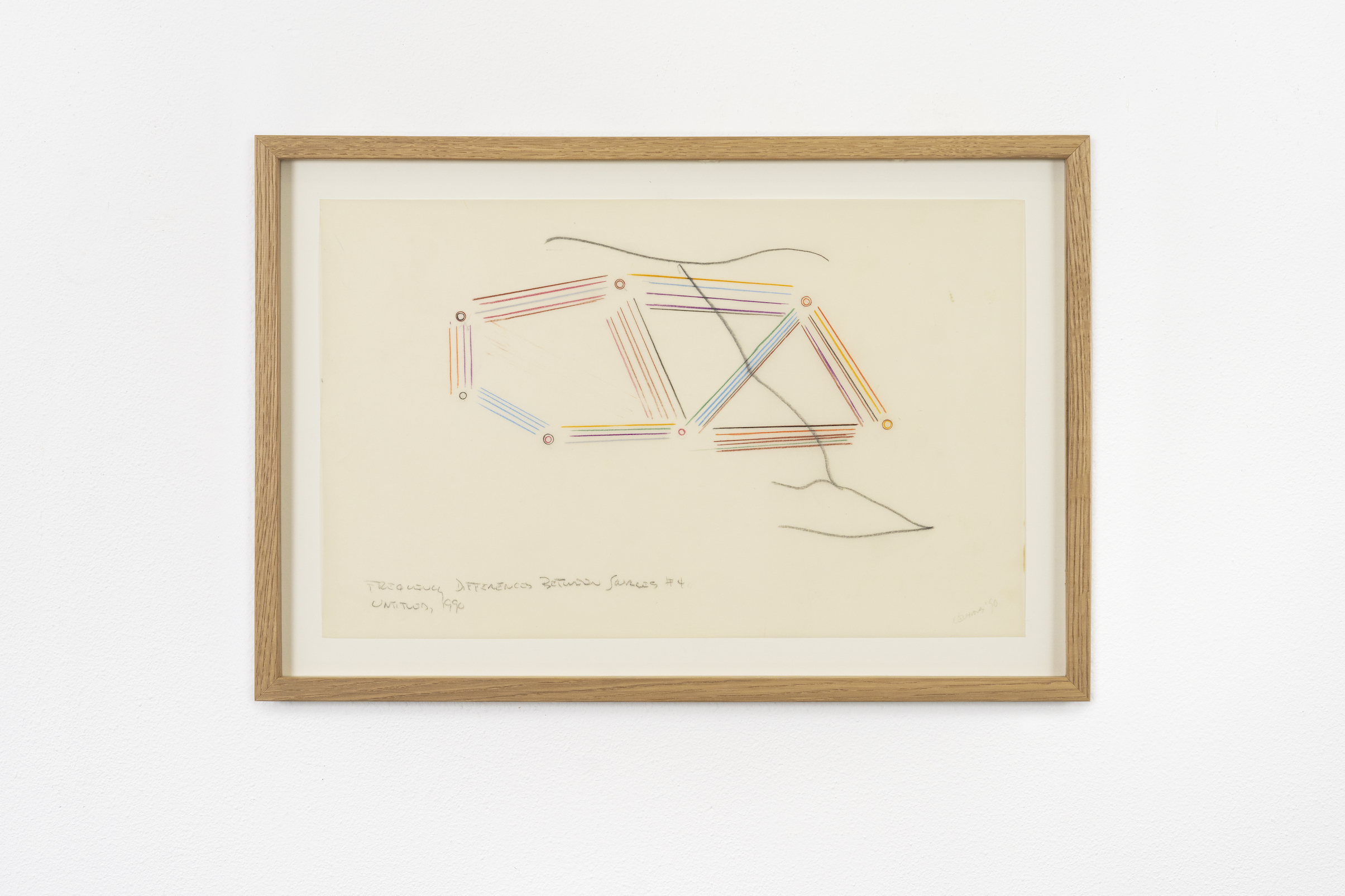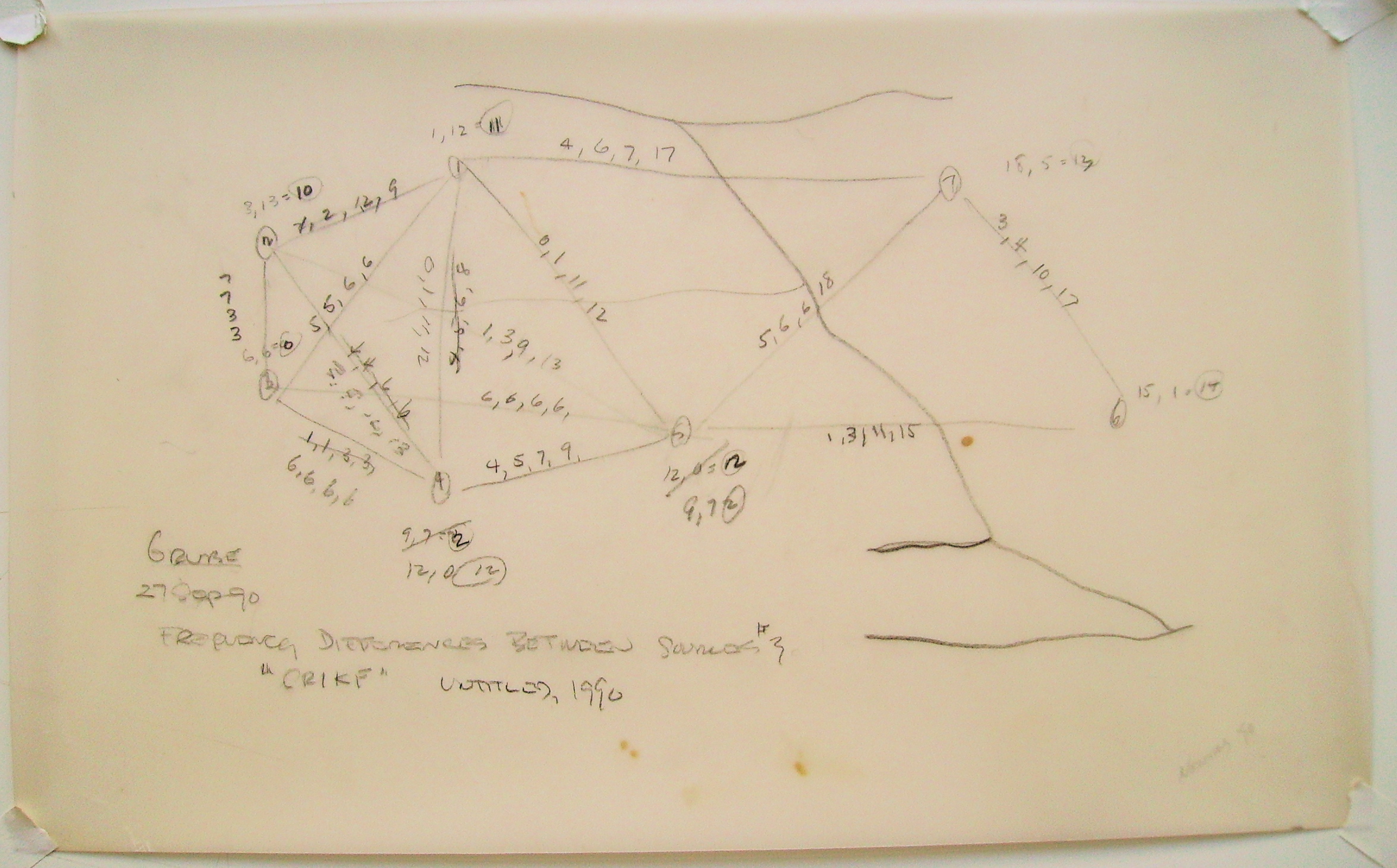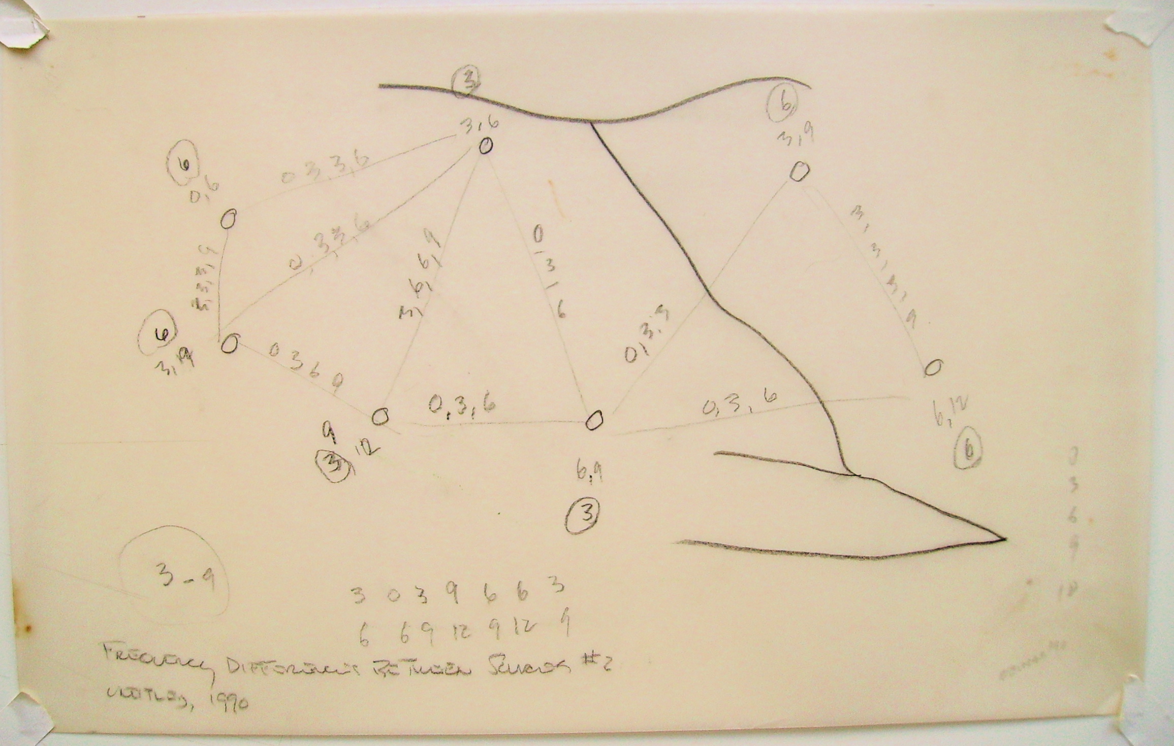 Included are a group of 12 working drawings showing the locations of the work's seven sound sources and the frequency relationships between them which created the work's sound texture. Also included is a version of the image panel of the work's circumscription drawing along with studies which trace its development. m.n.
