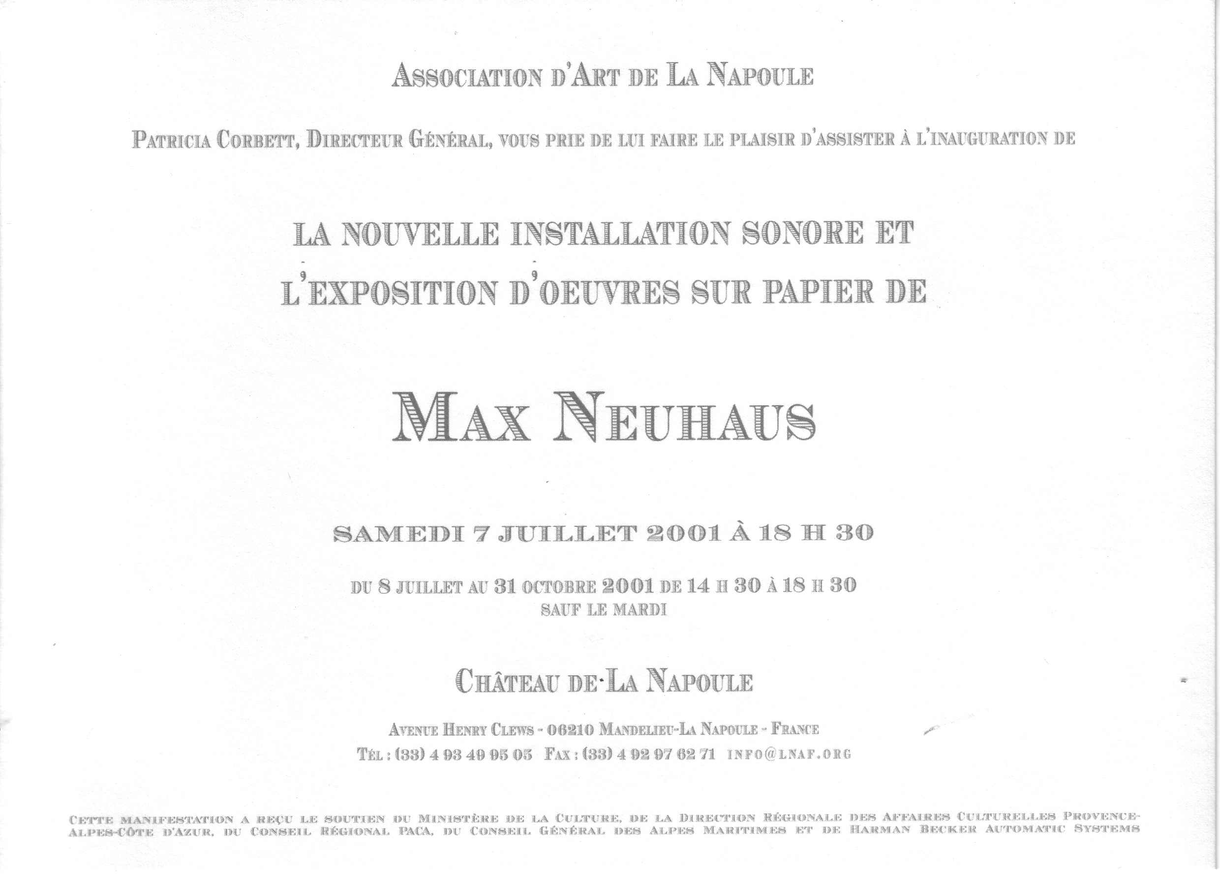 Drawing Exhibition Max Neuhaus, (Solo Show) , An Exhibition of Works on Paper, La Napoule Art Foundation, Mandelieu-La Napoule, 2001