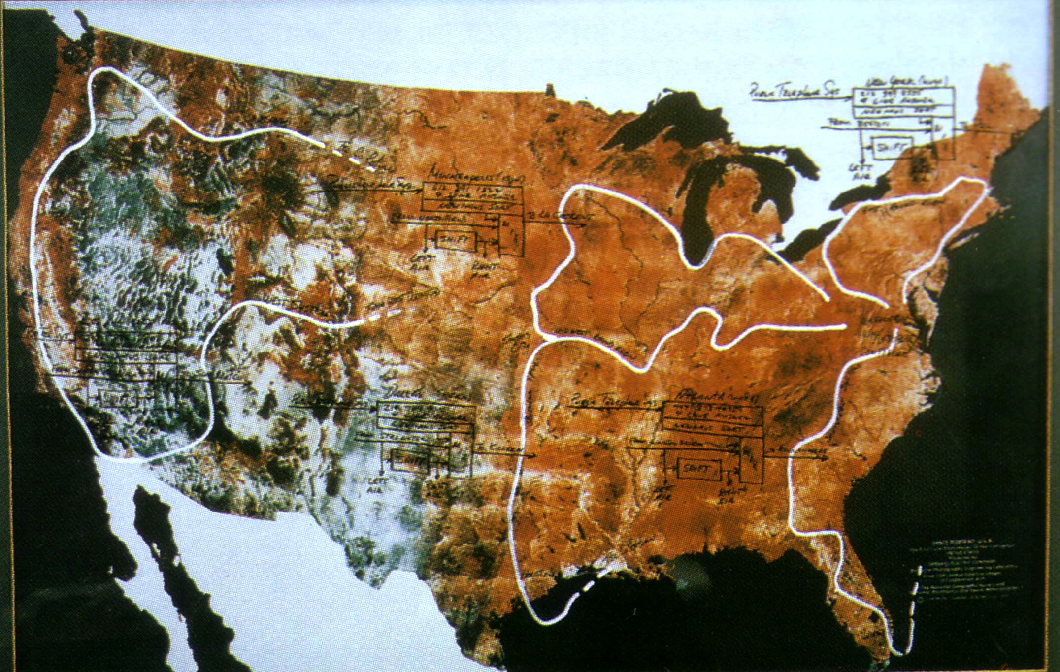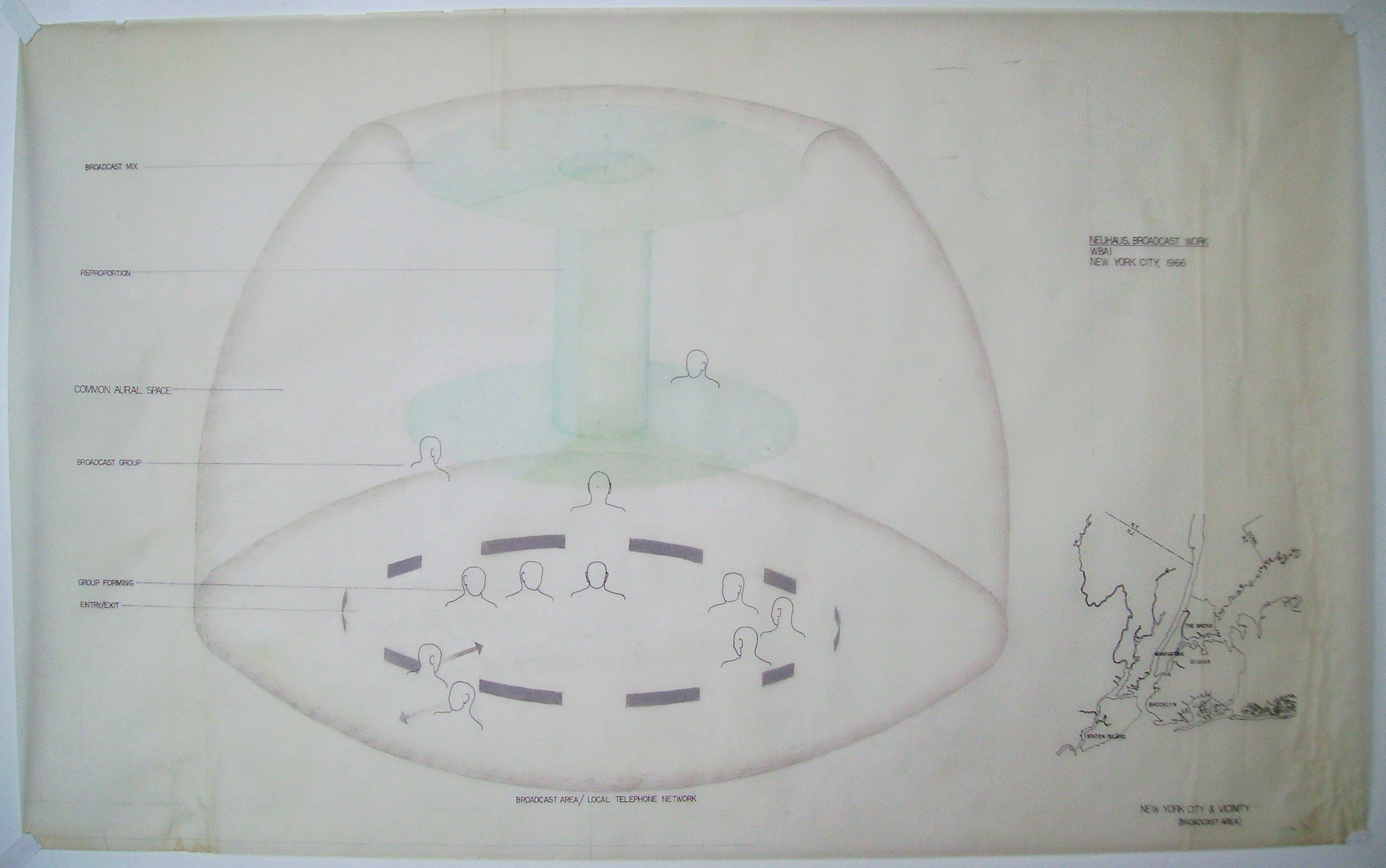 The drawing describes the first work in 1966. It represents the aural space which was formed by a radio broadcast covering one thousand two hundred square miles of the New York Metropolitan area, and its telephone network. The work was initiated by advertising a phone number and a broadcast time. It was also necessary to explain that their calls would be put on the air, as this was well before the time when the format of a radio phone-in program was practiced.