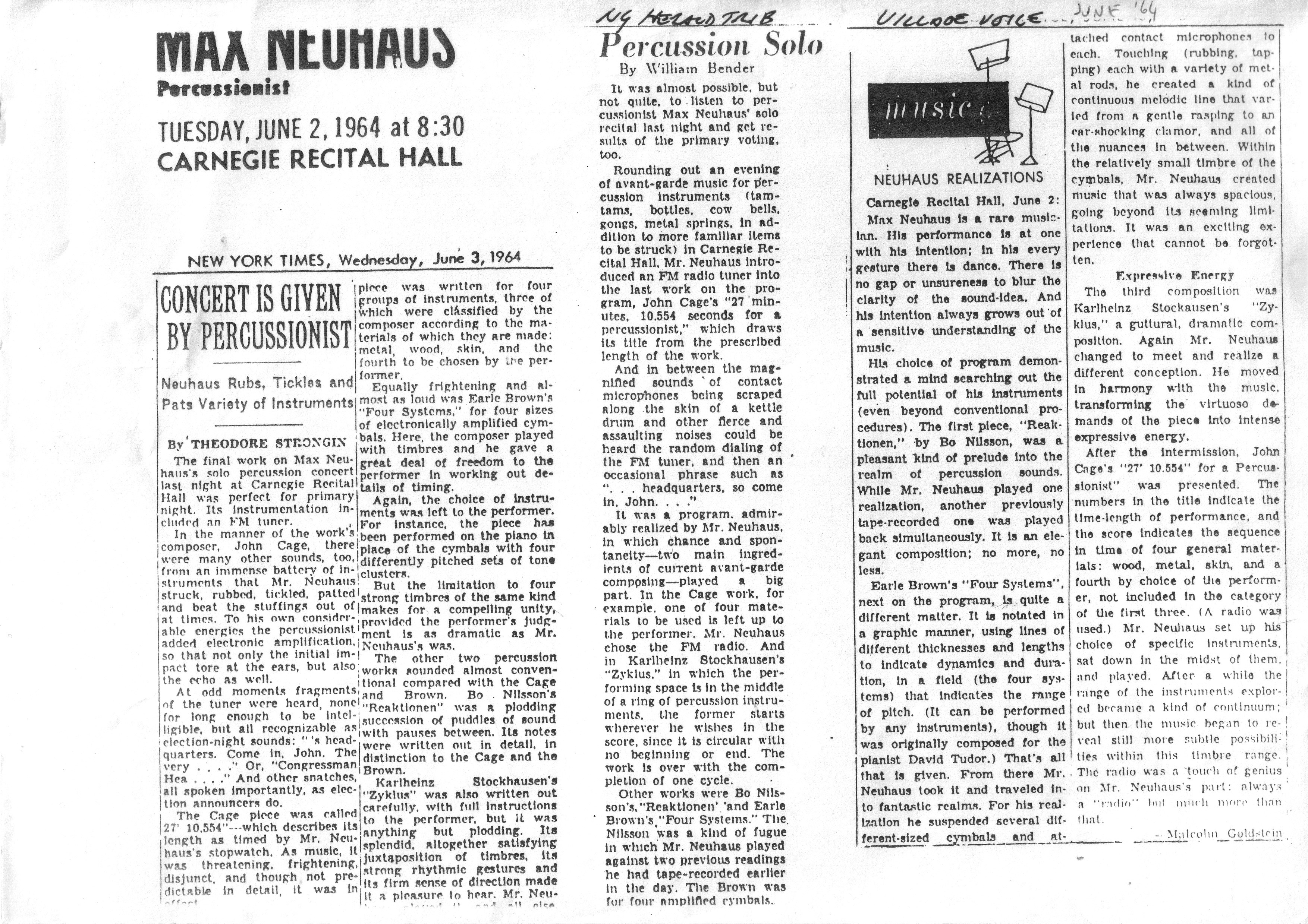 Percussion soloist with Karlheinz Stockhausen, touring major cities in United States and Canada. Solo recital Hall, New York city.