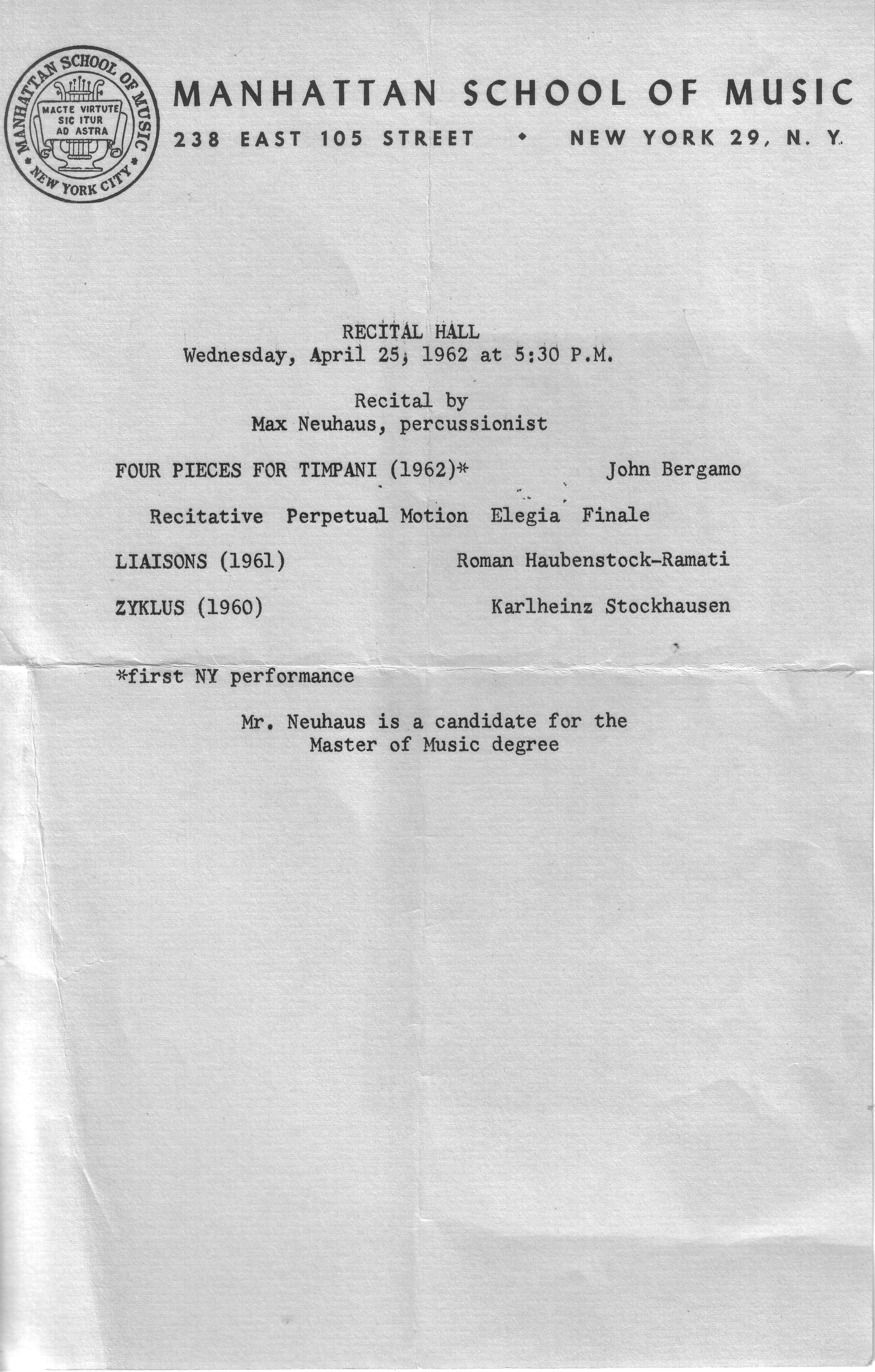 Manhattan School Of Music, Recital Hall, Max Neuhaus percursionist 'Mr. Neuhaus is a candidate for the Master of Music degree'. April 25, 1962,