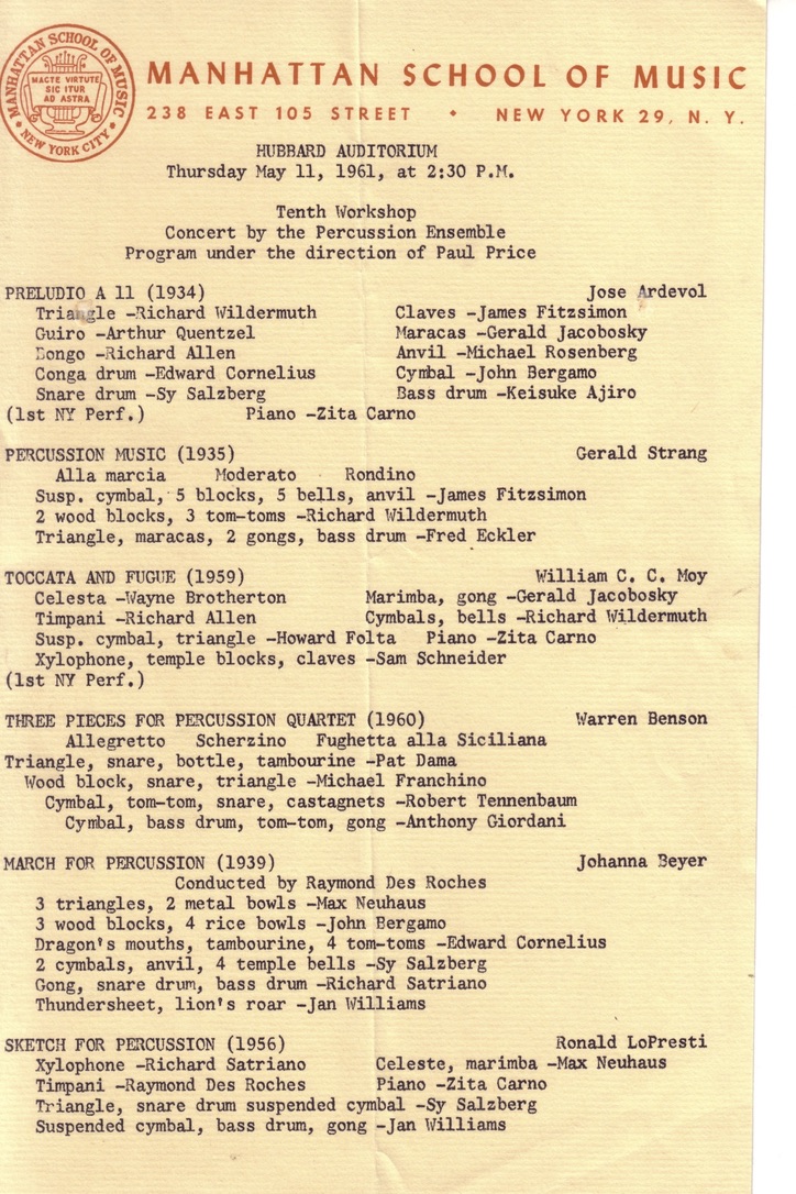 On May 11, 1961, the Manhattan School of Music Percussion Ensemble, under the direction of Paul Price, performed a concert as part of its Tenth Workshop. This concert, which featured several world, U.S., and New York City premieres, was likely held at the school's Hubbard Auditorium