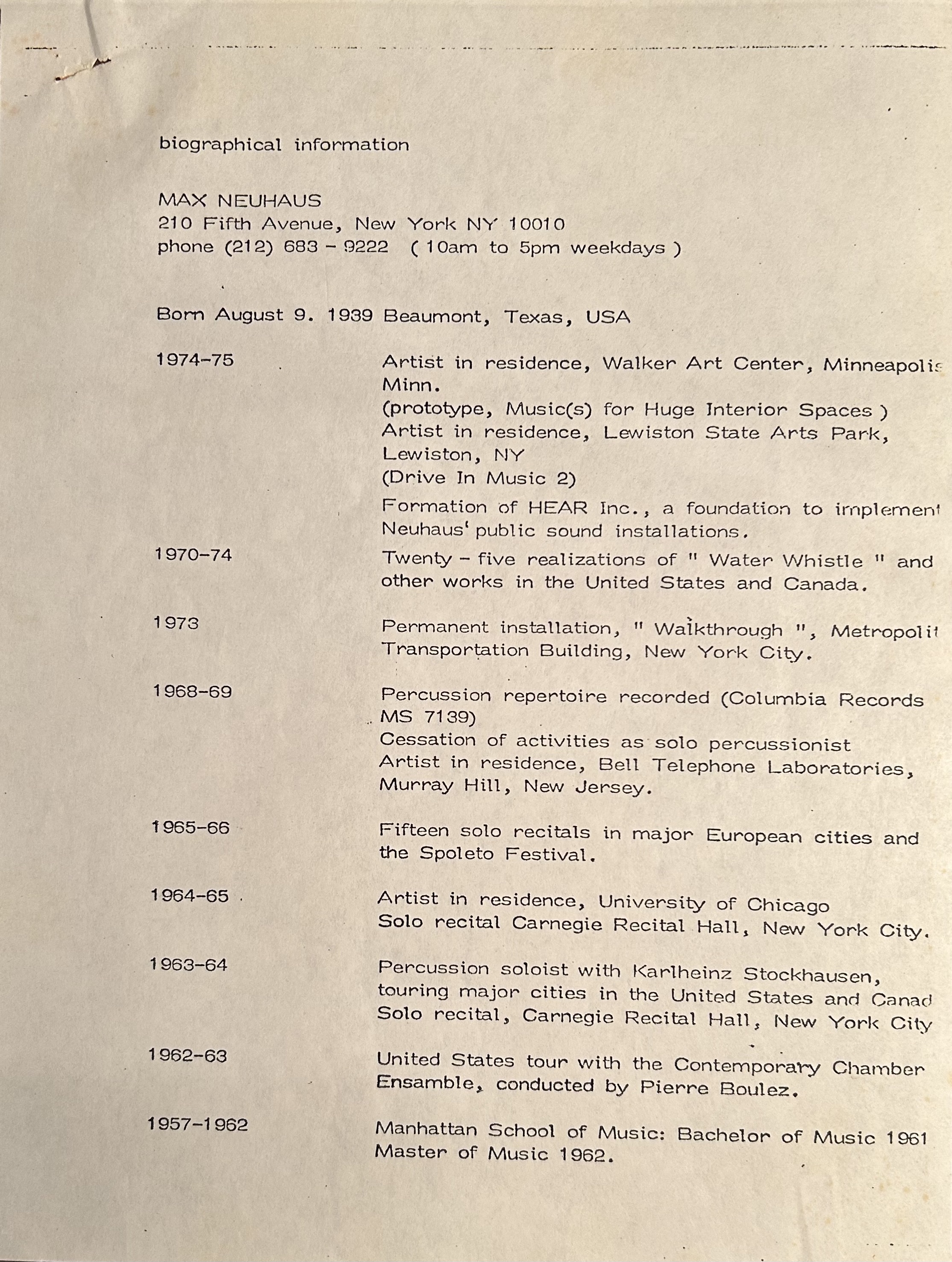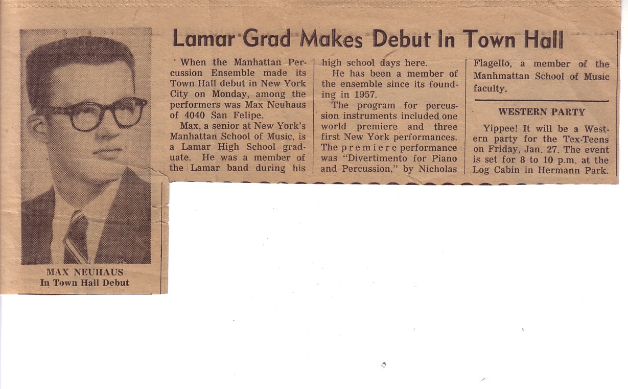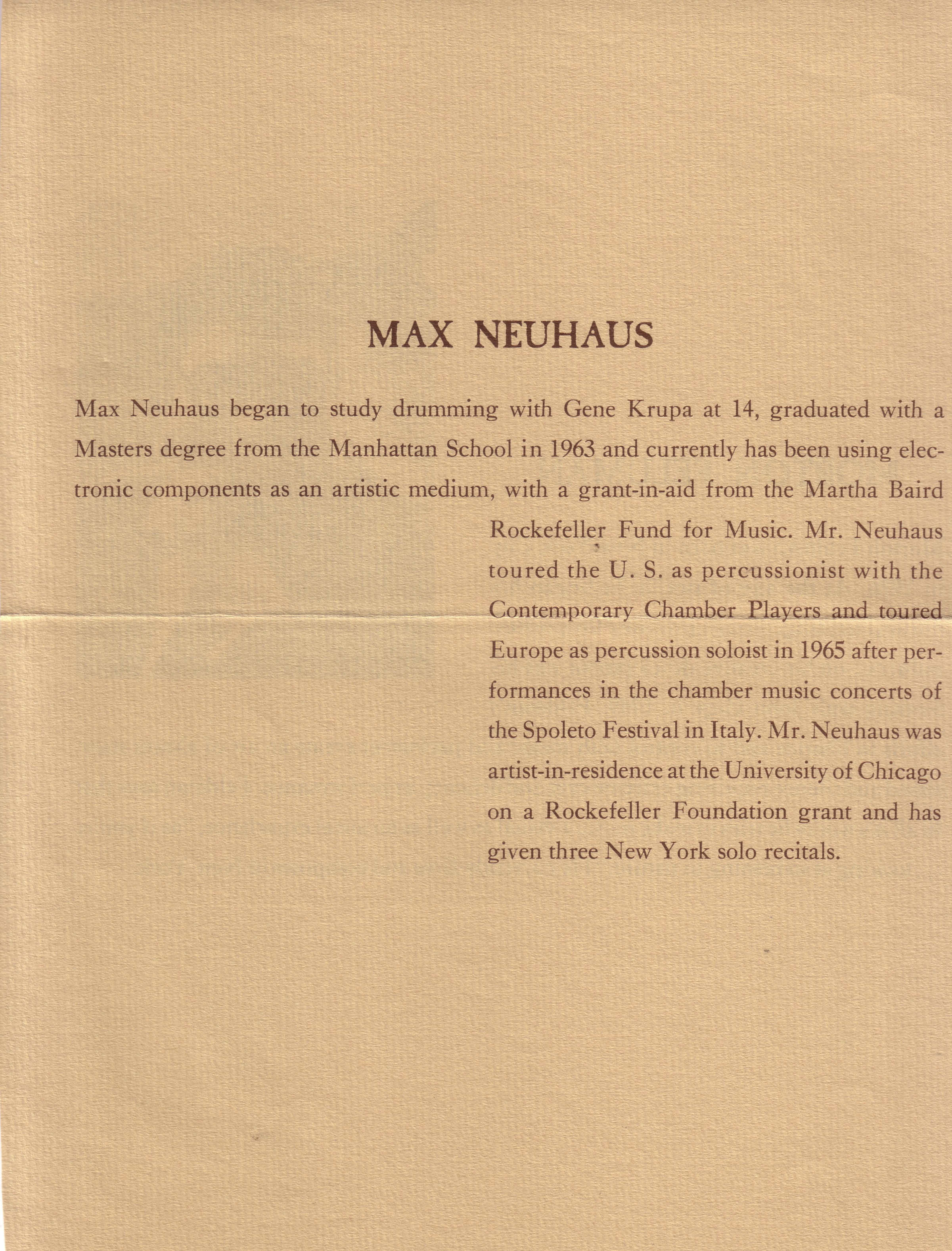 Manahattan School of Music: Max Neuhaus Bachelor of Music (1961) and a Master of Music (1963)