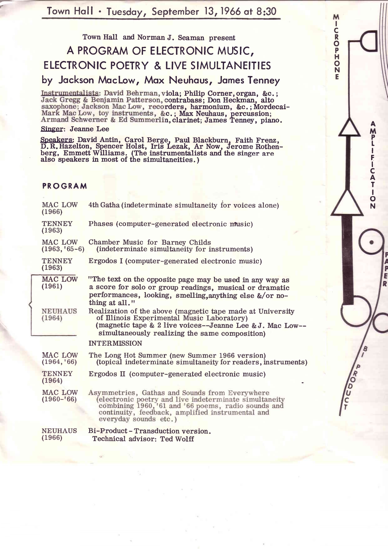 On September 13, 1966, a program of experimental music and poetry featuring Jackson MacLow, Max Neuhaus, and James Tenney was presented at New York's Town Hall. The event showcased the three artists' work in electronic and multimedia performance.