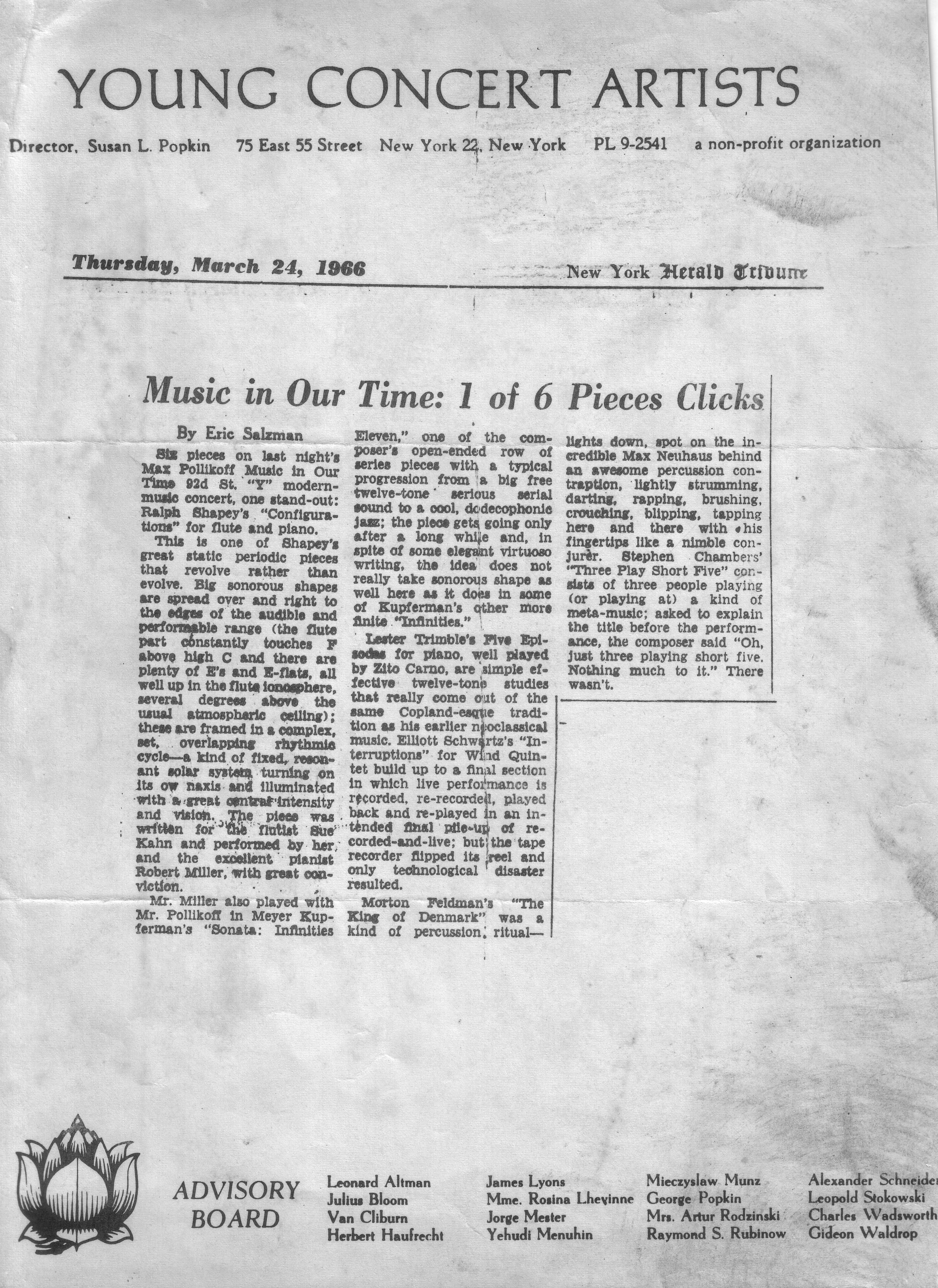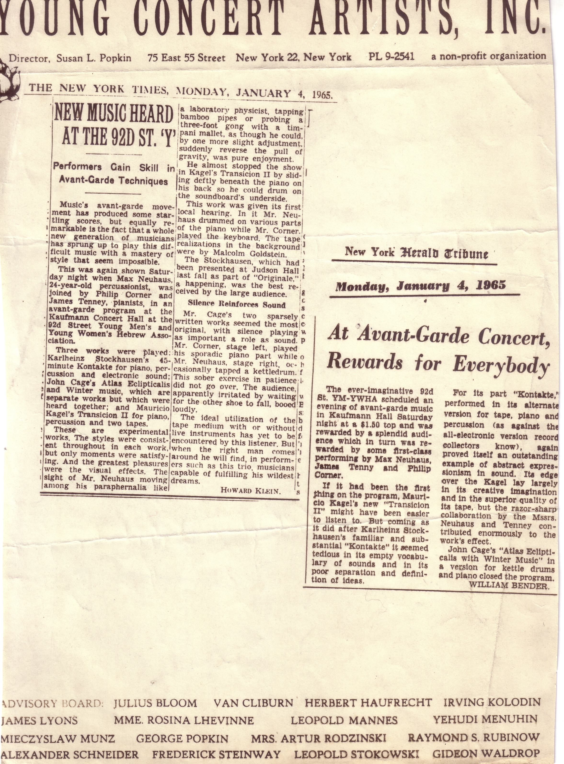 Three Hours of Sound Costruction. Young Concert Artist series, Susan Popkin Wadworth director, Carnegie Recital Hall, January 8, 1965.