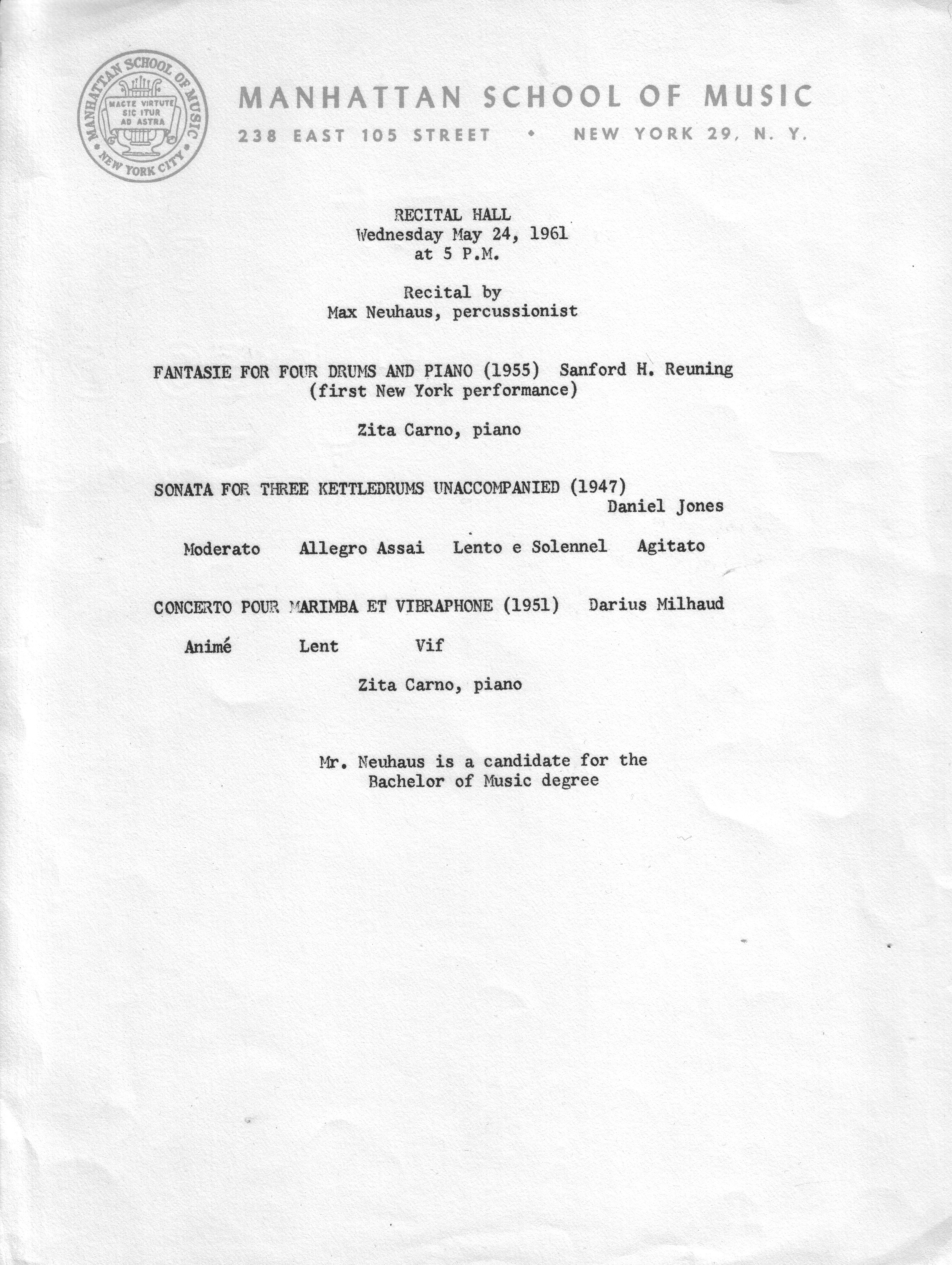 On May 24, 1961, Max Neuhaus gave a percussion recital as a candidate for the Bachelor of Music (B.M.) degree at the Manhattan School of Music. This event marks an important moment in his career as a musician and performer of avant-garde music prior to his transition to sound art.
