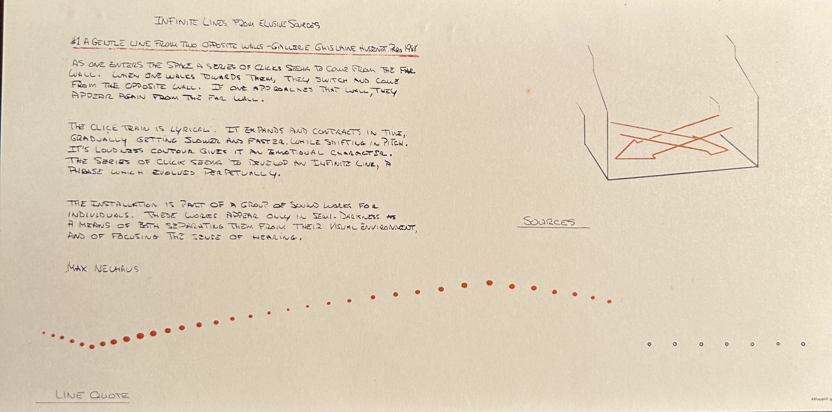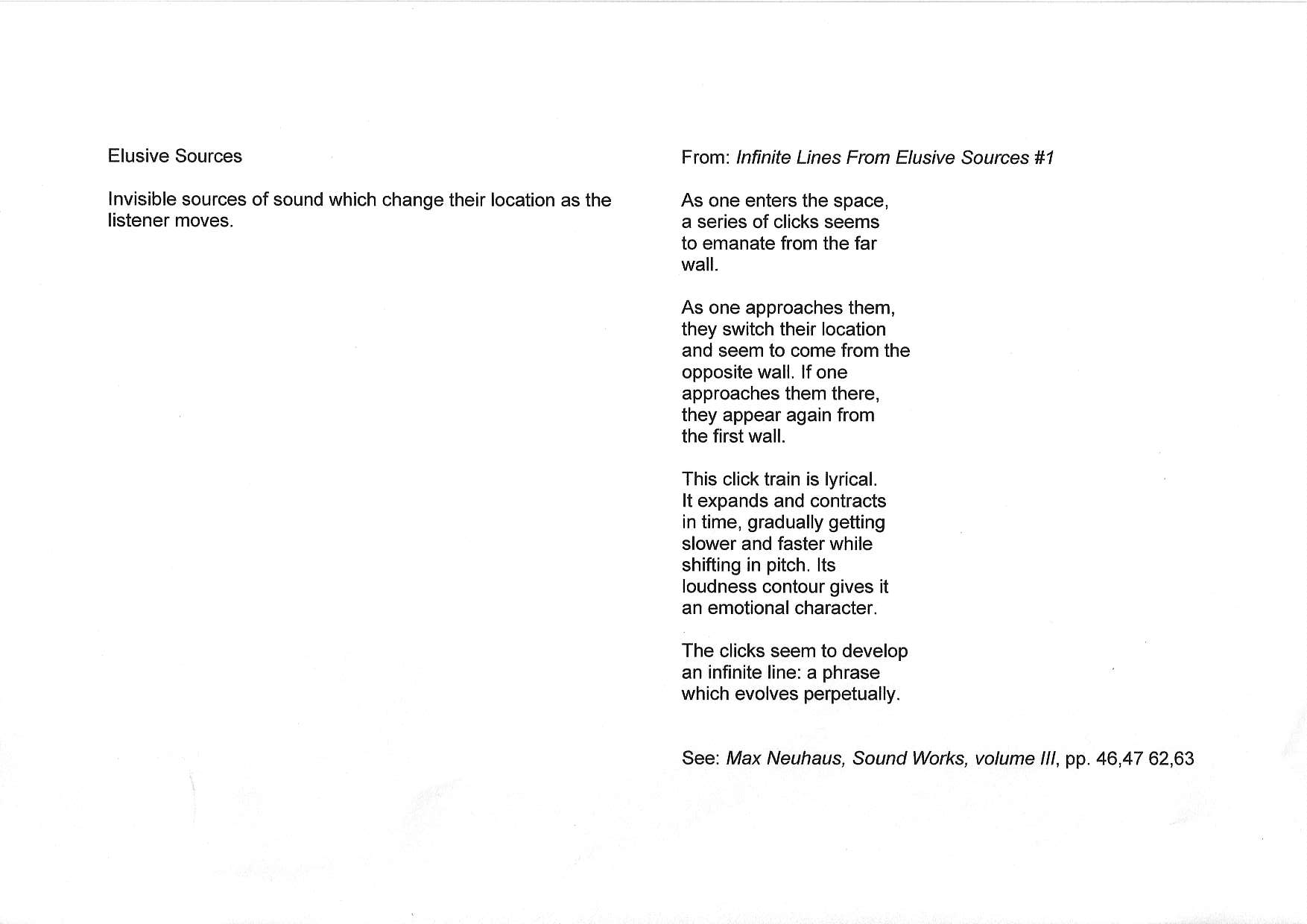 Drawings in: Max Neuhaus, Elusive Sources And "Like" Spaces. Giorgio Persano Turin: 1990. Catalogue