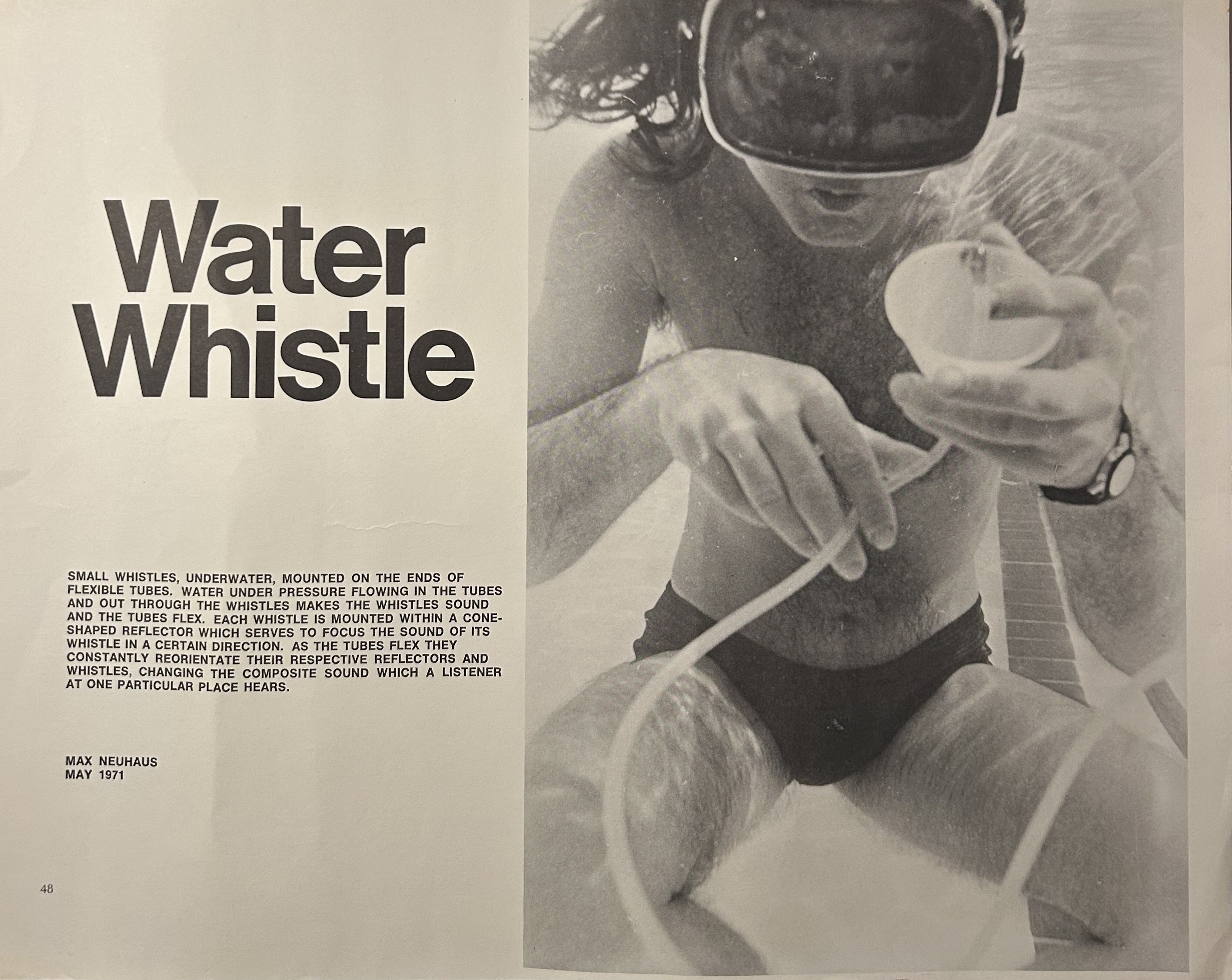 ("Water Whistle" 1-1 7) All of the sounds in these pieces were made by running water through small whistles, installed in various configurations underwater. Each work was made by choosing a set of whistles and whistle locations for each pool, and each grew out of the individual acoustic characteristics due to their differing underwater shape and size. Another series is now being developed utilizing underwater loudspeakers and electronically generated sounds.