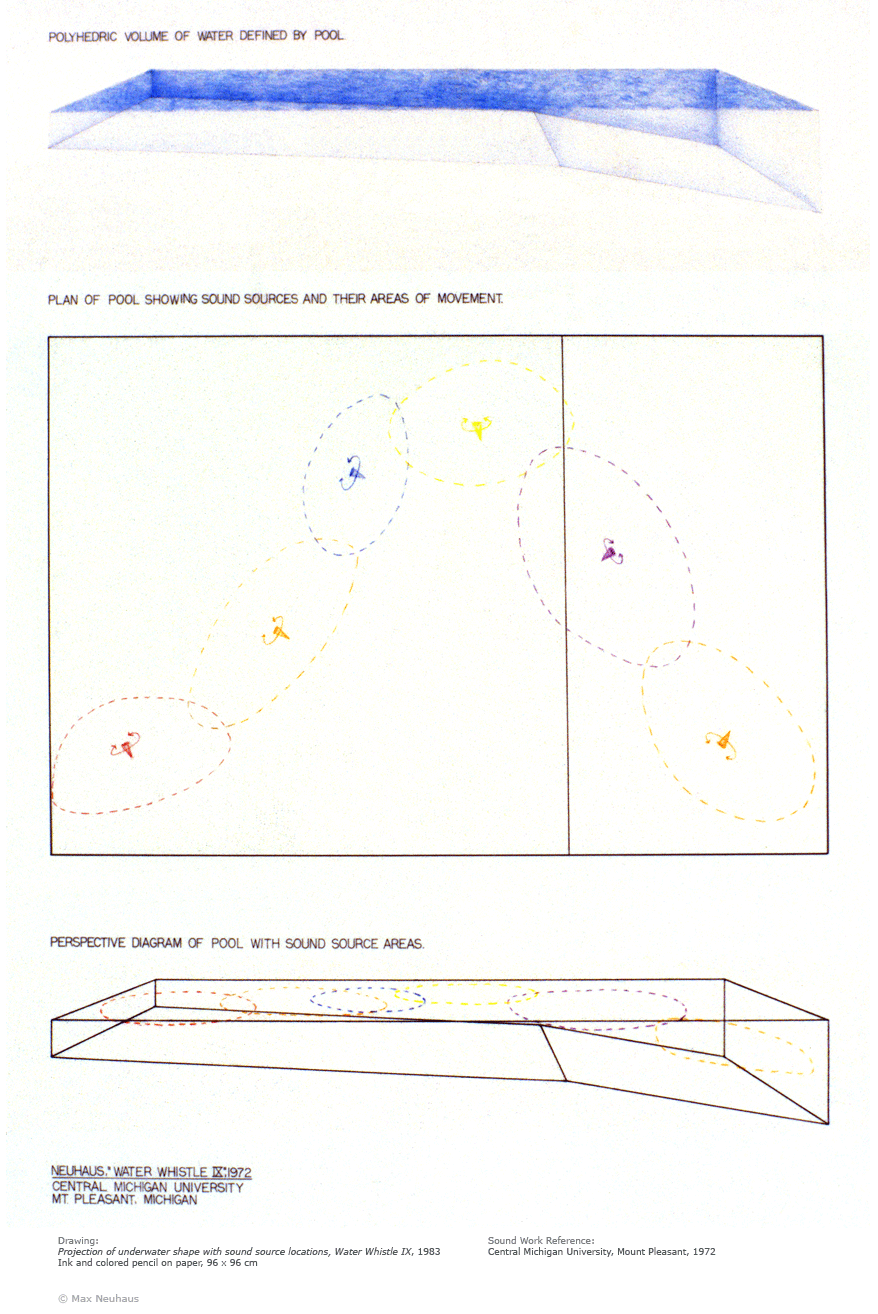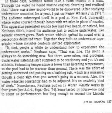 ("Water Whistle" 1-1 7) All of the sounds in these pieces were made by running water through small whistles, installed in various configurations underwater. Each work was made by choosing a set of whistles and whistle locations for each pool, and each grew out of the individual acoustic characteristics due to their differing underwater shape and size. Another series is now being developed utilizing underwater loudspeakers and electronically generated sounds.