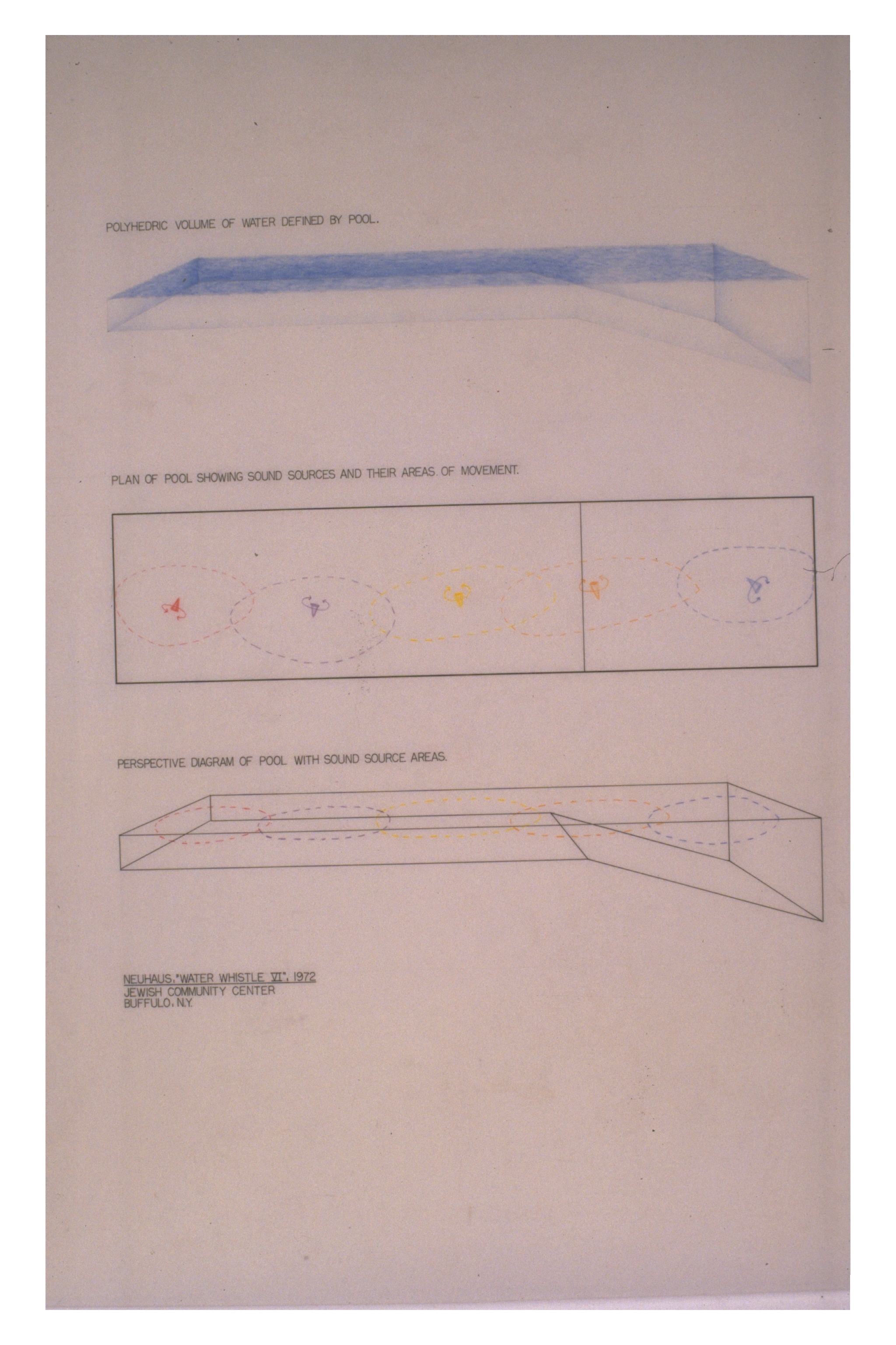 ("Water Whistle" 1-1 7) All of the sounds in these pieces were made by running water through small whistles, installed in various configurations underwater. Each work was made by choosing a set of whistles and whistle locations for each pool, and each grew out of the individual acoustic characteristics due to their differing underwater shape and size. Another series is now being developed utilizing underwater loudspeakers and electronically generated sounds.